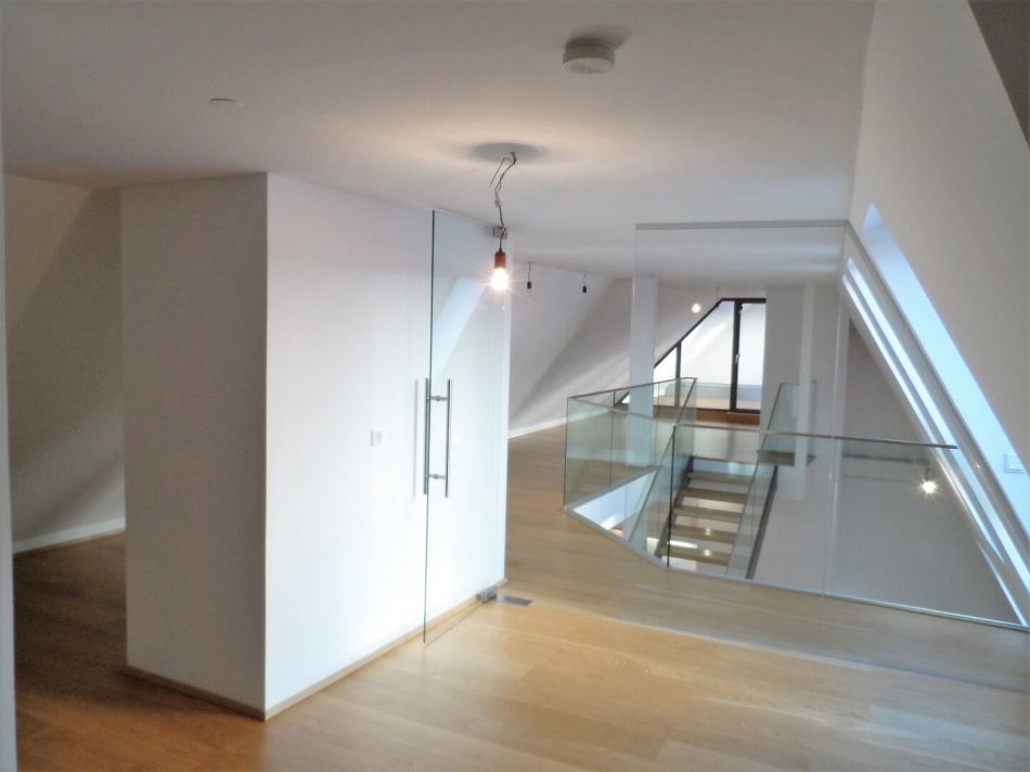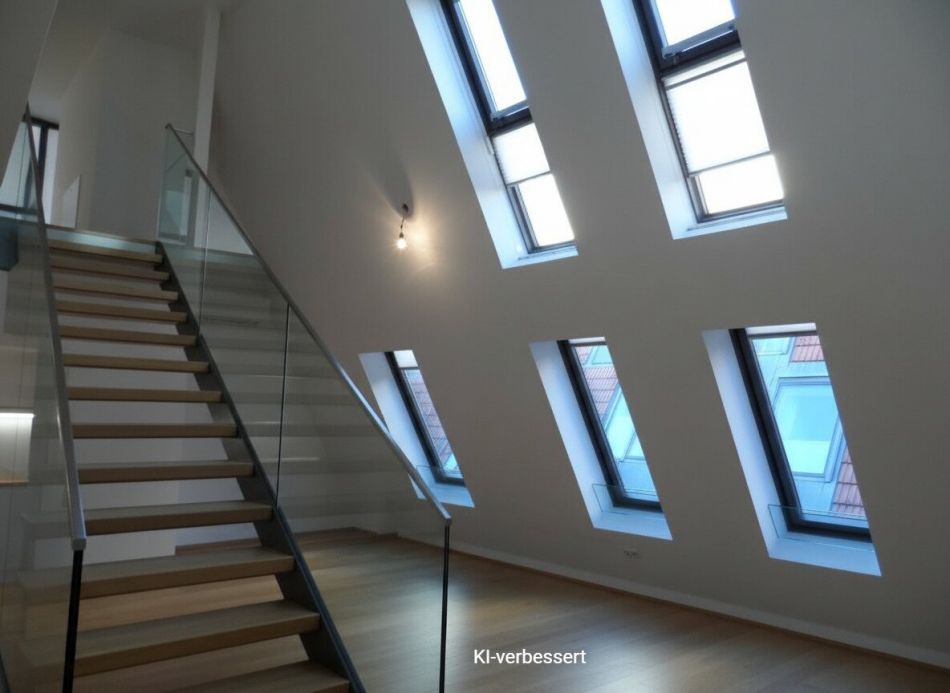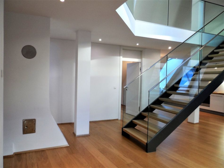 Über die Stiege inmitten des Raumes gelangen Sie in das obere Stockwerk der Wohnung. Dort befindet sich eine offen gestaltete Galerie, die sich vielseitig nutzen lässt. Zu beachten ist, dass dieser Bereich offen gestaltet ist und nicht durch eine Tür abgetrennt ist! Zusätzlich steht ein weiteres, durch eine Tür abgetrenntes Zimmer mit ca. 31 m² zur Verfügung.
