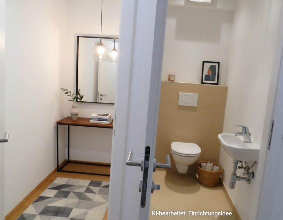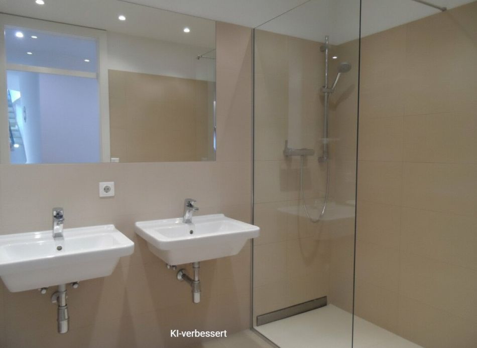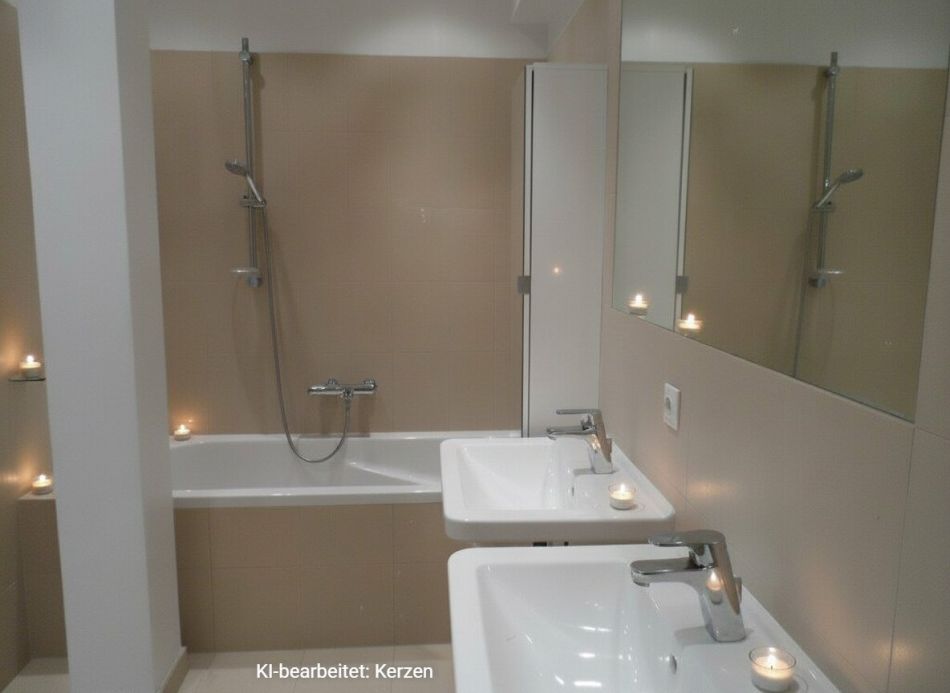 Beim Betreten der Wohnung gelangen Sie in einen großzügigen Vorraum, der durch eine kleine Trennwand strukturiert ist und viel Platz für eine Garderobe bietet. Gleich links befindet sich ein praktischer Abstellraum mit Waschmaschinenanschluss. Daran anschließend liegen ein separates WC mit Handwaschbecken sowie das Badezimmer, welches mit zwei Handwaschbecken, Badewanne und einer Dusche ausgestattet ist.