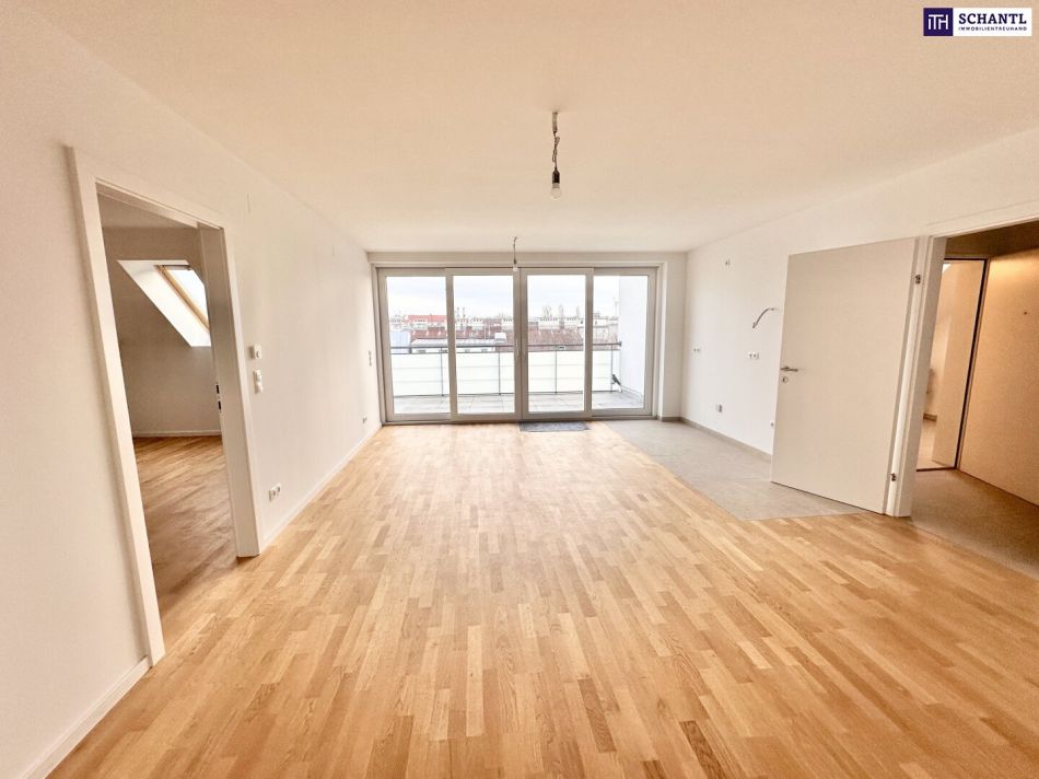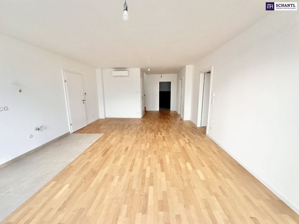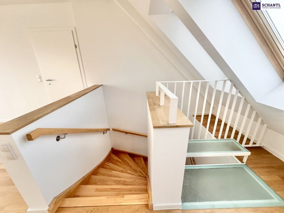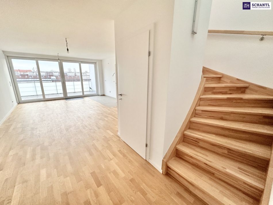 Der Zugang zur Wohnung erfolgt über das untere Geschoss. Hier erwartet Sie ein großzügiges Vorzimmer, das in den lichtdurchfluteten Wohnbereich mit offener Küche übergeht. Zwei weitere Zimmer bieten sich ideal als Schlaf-, Kinder- oder Arbeitszimmer an. Ein großer Abstellraum, ein Gäste-WC und ein luxuriös ausgestattetes Badezimmer mit Doppelwaschbecken, Dusche und Badewanne sorgen für höchsten Wohnkomfort. Der Balkon mit ca. 14,35 m² erweitert den Wohnbereich ins Freie und lädt zum Entspannen ein.