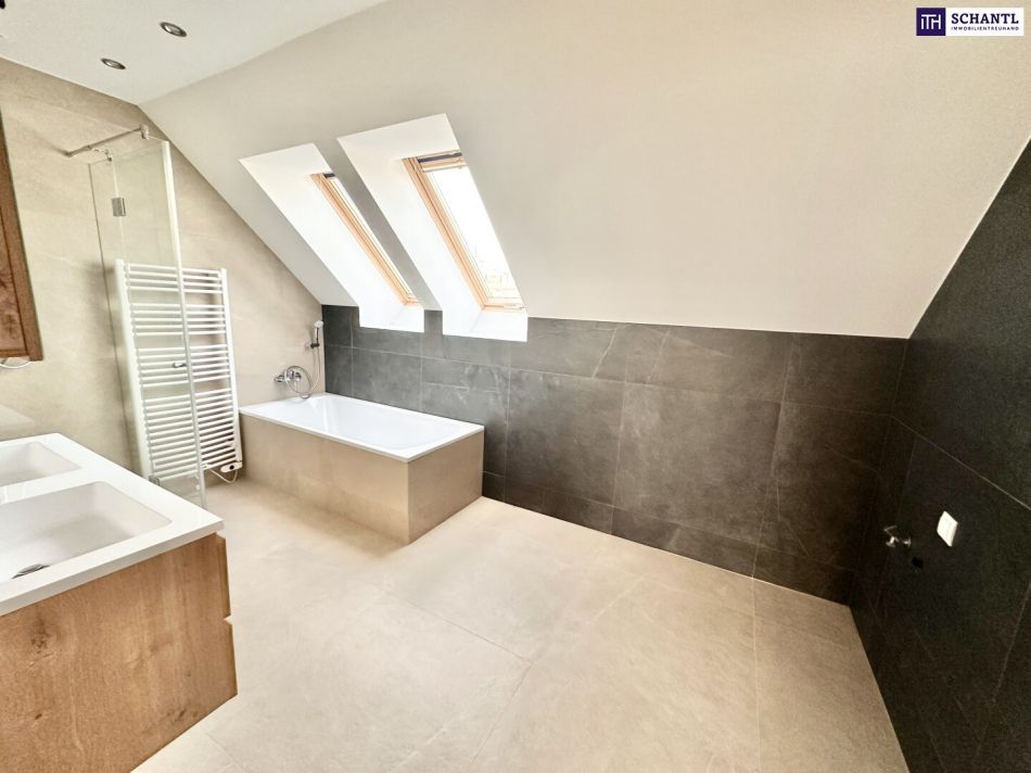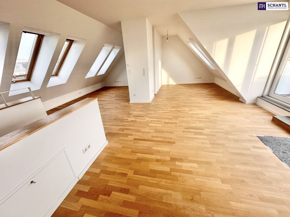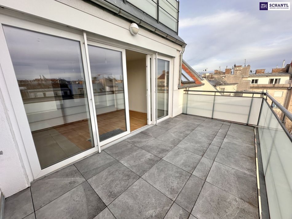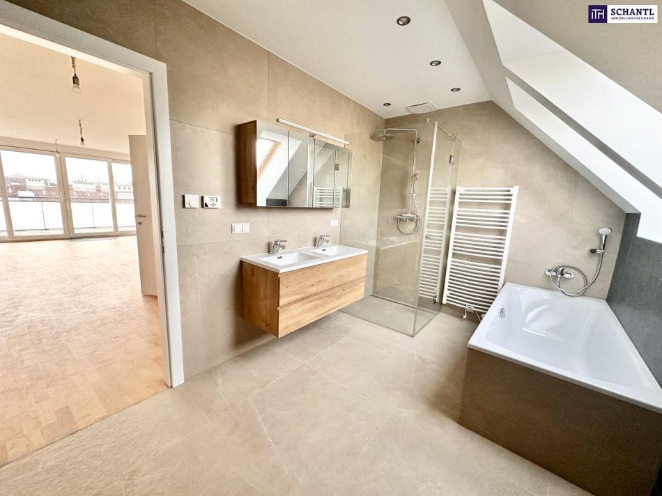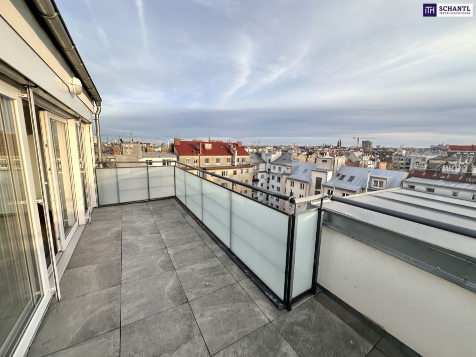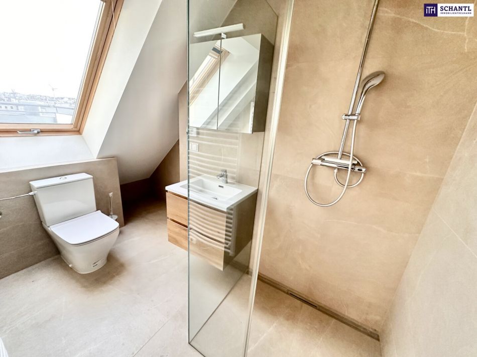 Im oberen Geschoss erwartet Sie ein beeindruckender Wohnraum mit knapp 50 m² Fläche. Dieser Bereich lässt sich flexibel nutzen und kann bei Bedarf in zwei weitere Räume unterteilt werden. Das zweite Badezimmer ist mit Dusche, Waschbecken und WC ausgestattet. Von hier aus gelangen Sie auf die sonnige Dachterrasse mit 13,70 m², die einen beeindruckenden Panoramablick über die Stadt bietet – von der Innenstadt mit Stephansdom und Votivkirche bis hin zum Kahlenberg.