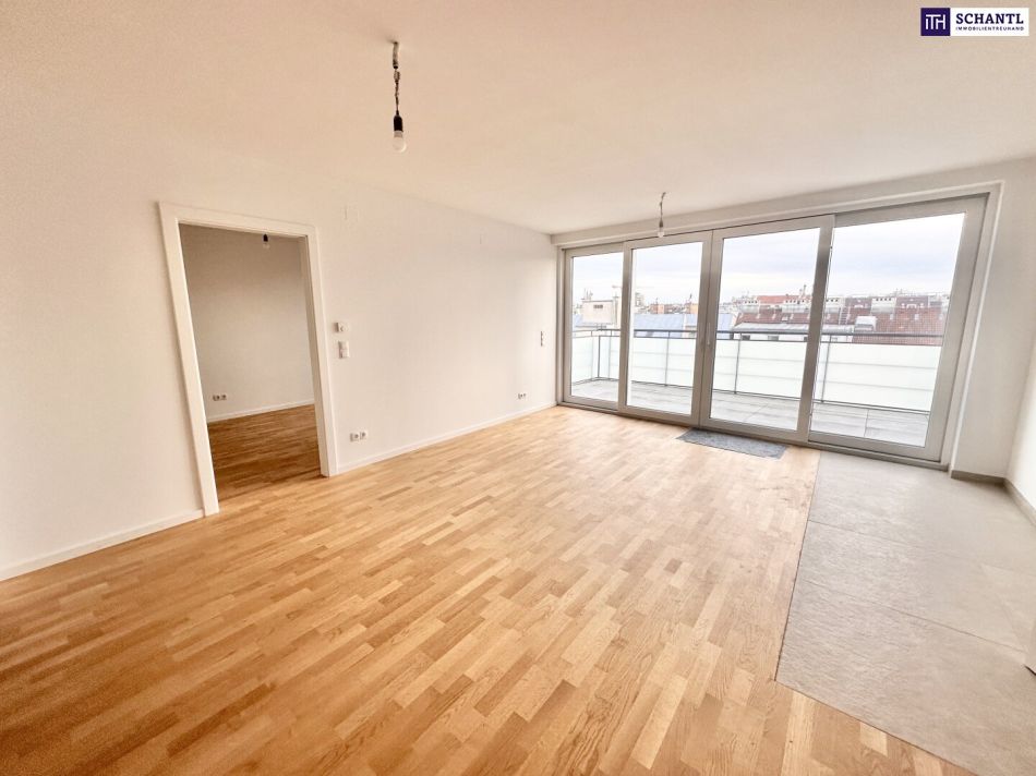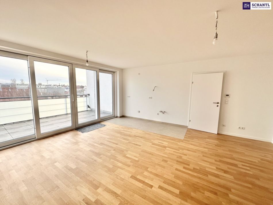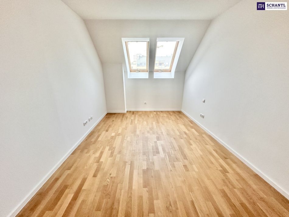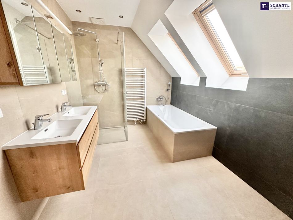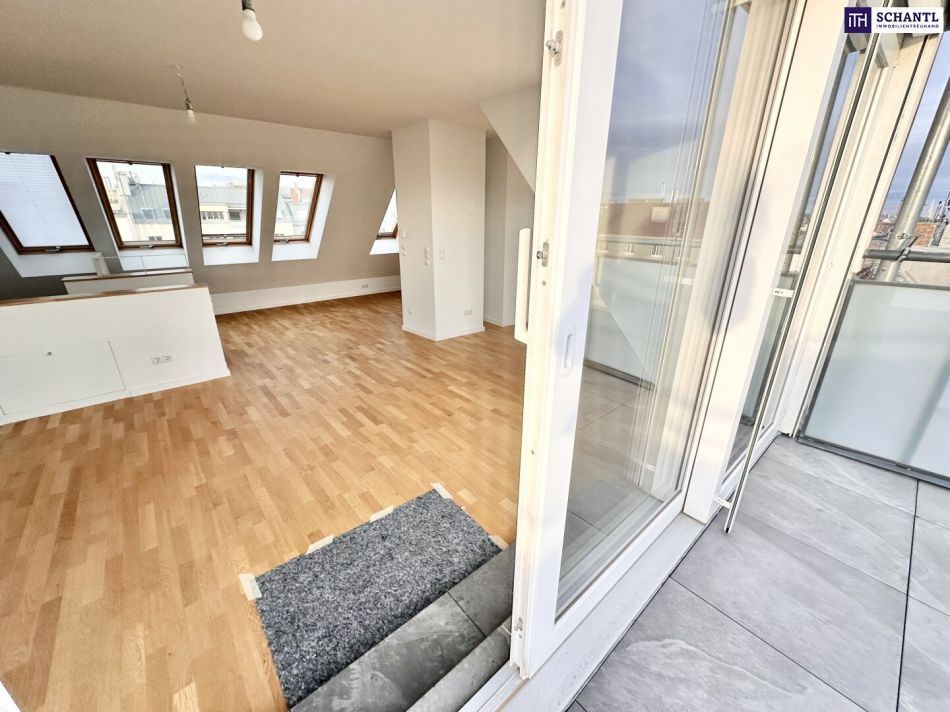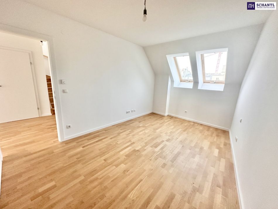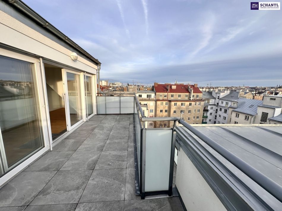 Im oberen Geschoss erwartet Sie ein beeindruckender Wohnraum mit knapp 50 m² Fläche. Dieser Bereich lässt sich flexibel nutzen und kann bei Bedarf in zwei weitere Räume unterteilt werden. Das zweite Badezimmer ist mit Dusche, Waschbecken und WC ausgestattet. Von hier aus gelangen Sie auf die sonnige Dachterrasse mit 13,70 m², die einen beeindruckenden Panoramablick über die Stadt bietet – von der Innenstadt mit Stephansdom und Votivkirche bis hin zum Kahlenberg.