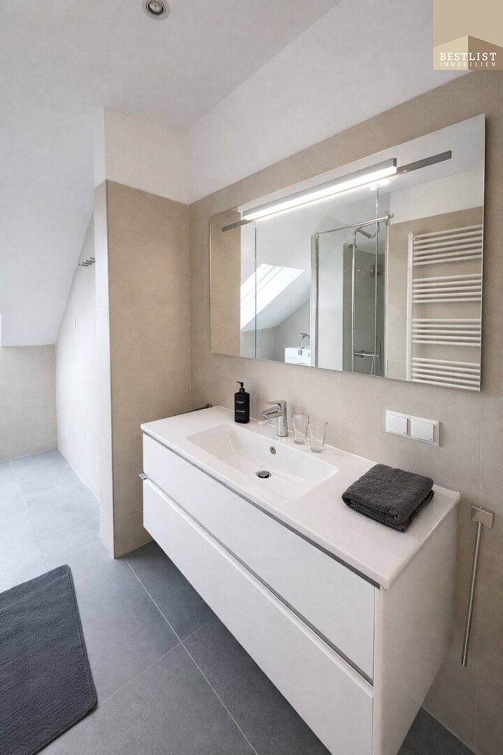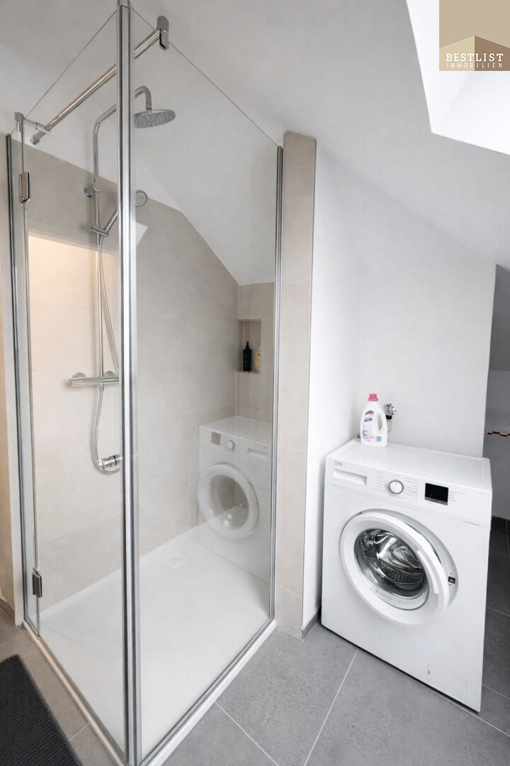 Das Badezimmer ist sehr modern ausgeführt und mit Dusche, Waschbecken sowie Waschmaschinenanschluss ausgestattet. Ein separates WC ergänzt das Raumangebot.