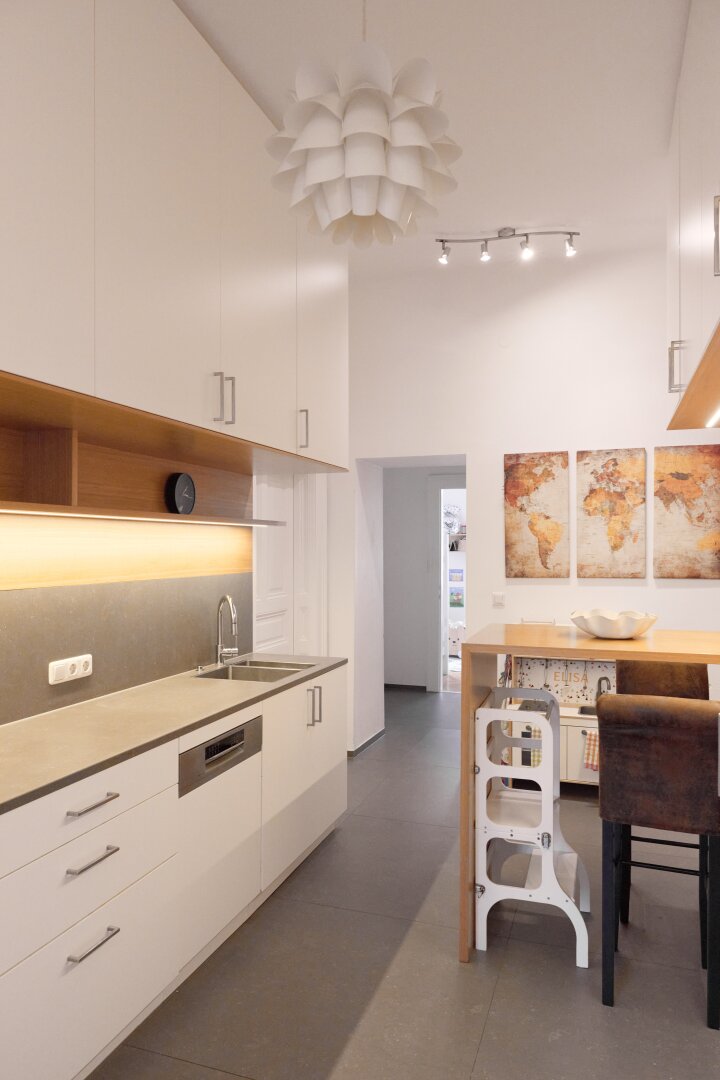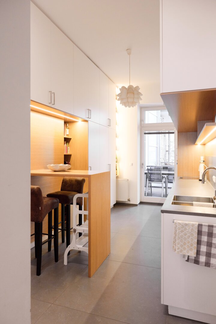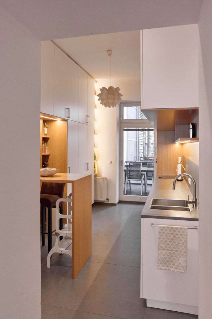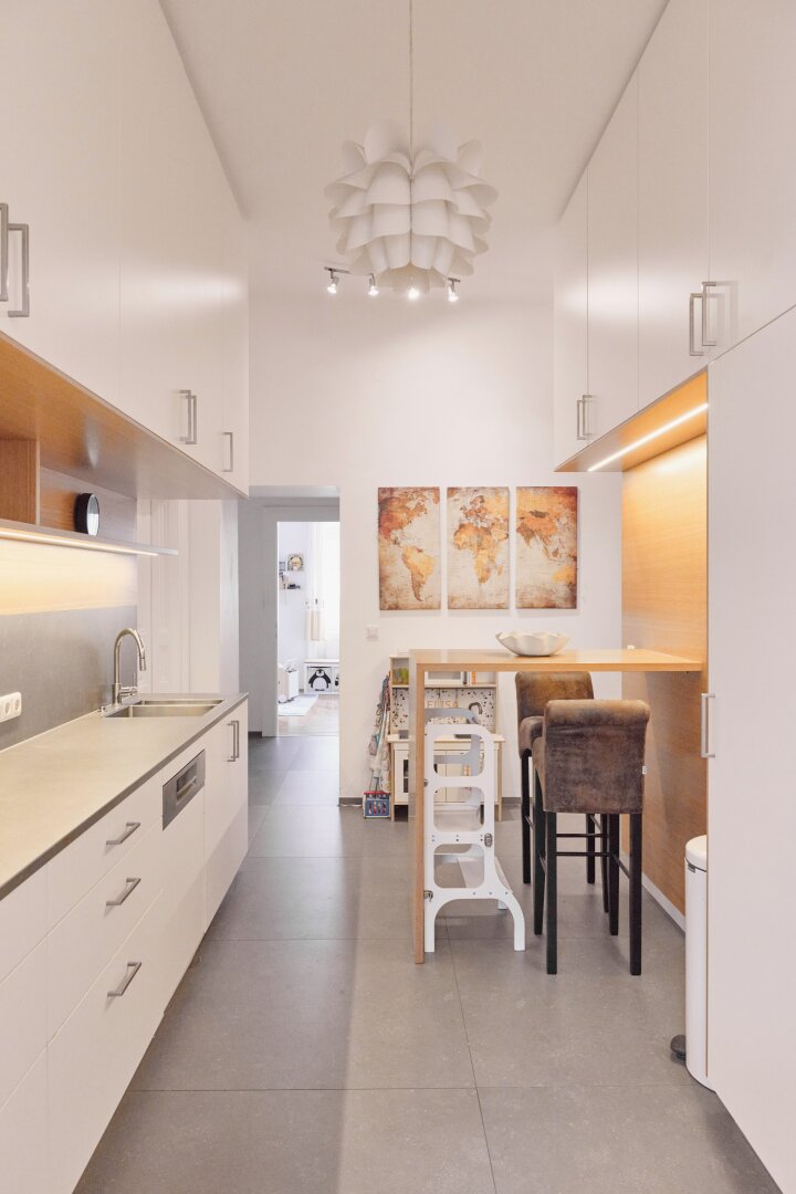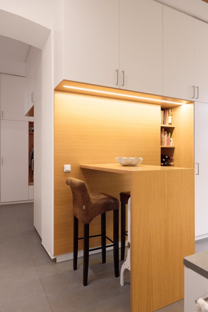 Die maßgefertigte Tischlerküche überzeugt mit hochwertiger Ausstattung, durchdachtem Stauraum und einem einladenden Bartisch – ideal für geselliges Kochen und Verweilen. Auch das Vorzimmer kann mit Tischlereinbauten aufwarten.