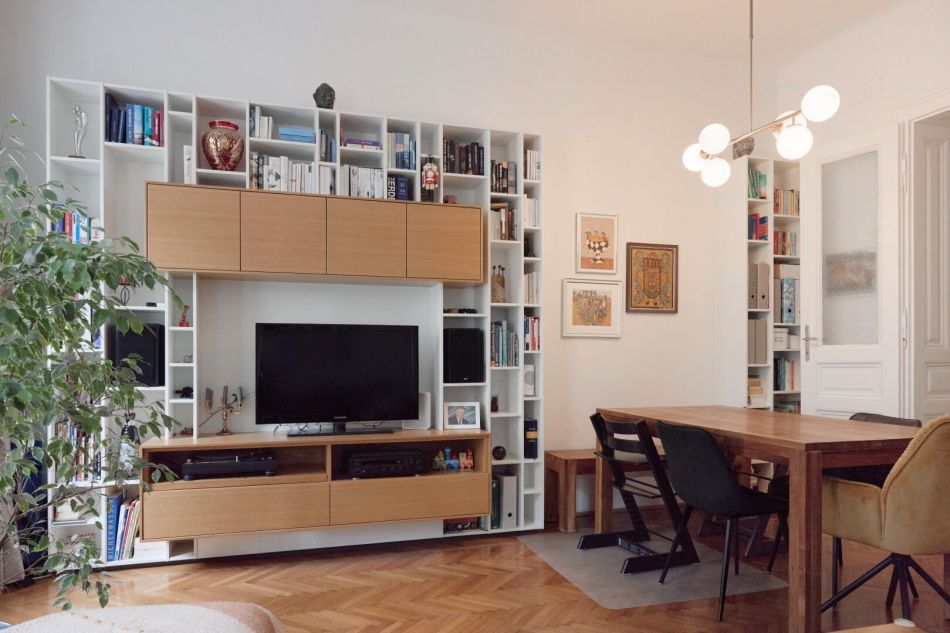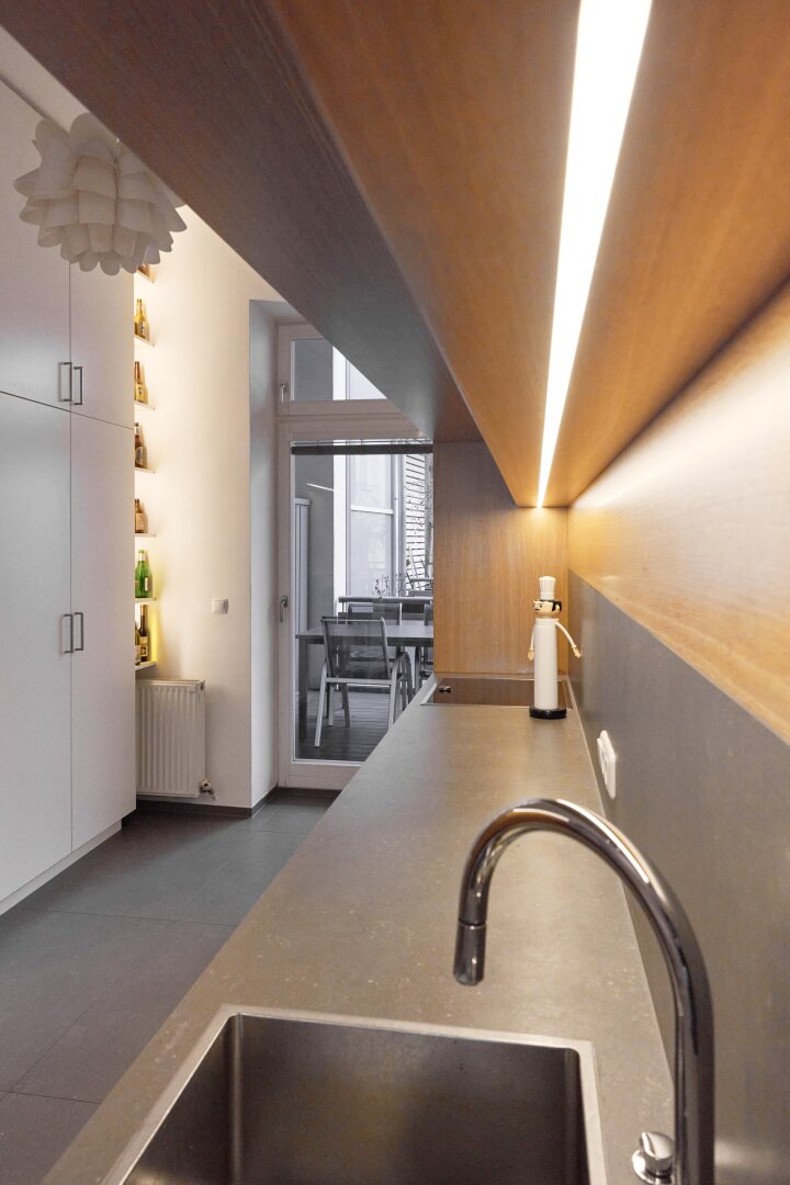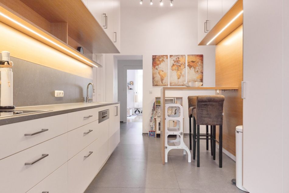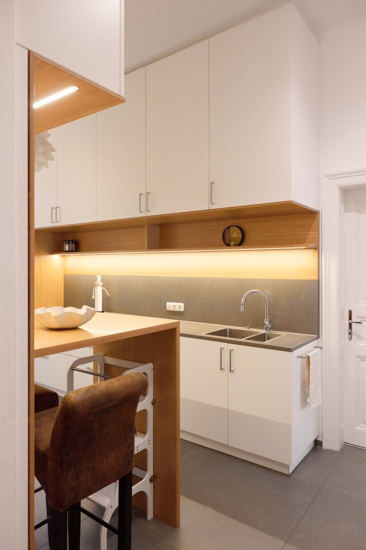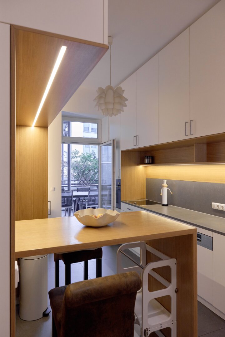 Die maßgefertigte Tischlerküche überzeugt mit hochwertiger Ausstattung, durchdachtem Stauraum und einem einladenden Bartisch – ideal für geselliges Kochen und Verweilen. Auch das Vorzimmer kann mit Tischlereinbauten aufwarten.