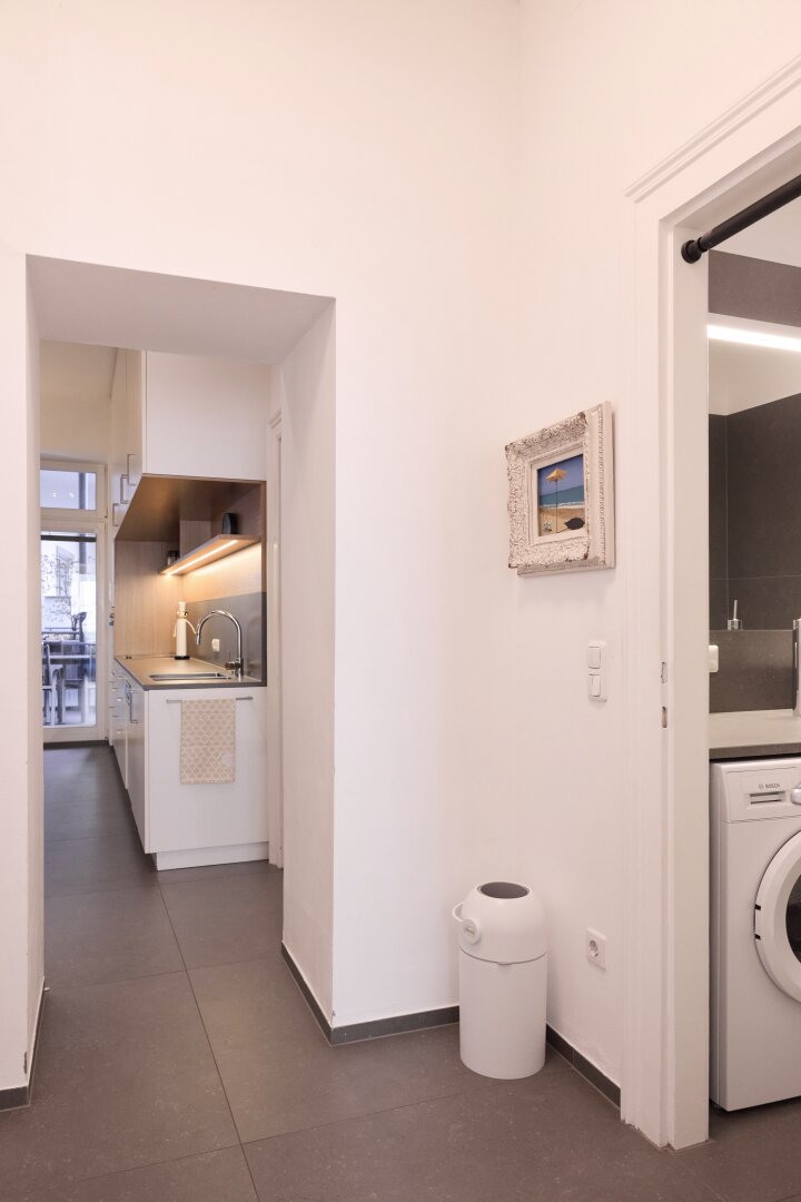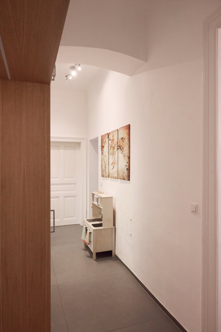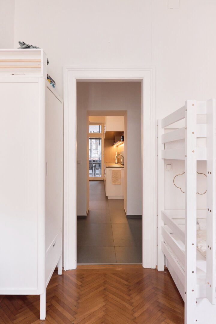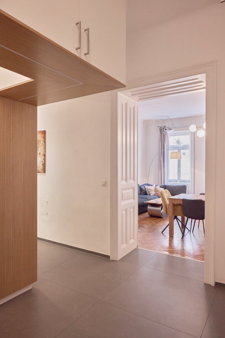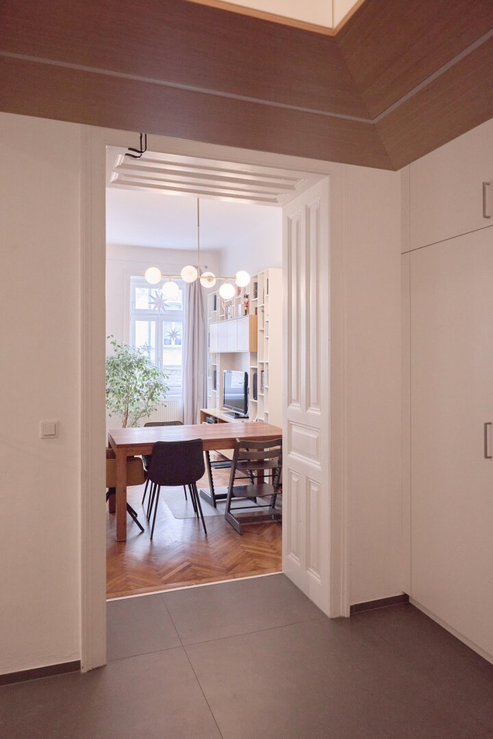 Der moderne, durchdachte Grundriss bewahrt den Altbau-Charakter und sorgt gleichzeitig für optimale Alltagstauglichkeit. Sämtliche Zimmer sind zentral begehbar. Durch die ost- und westseitige Ausrichtung kann die Wohnung gut durchgelüftet werden.