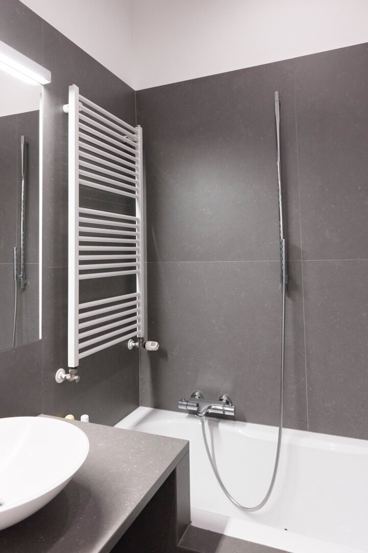 Zwei elegant gestaltete Badezimmer bieten zusätzlichen Komfort: ein großes Badezimmer mit Badewanne sowie ein zweites kleineres Badezimmer mit Walk-in-Dusche und WC.