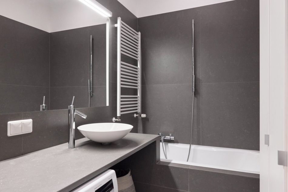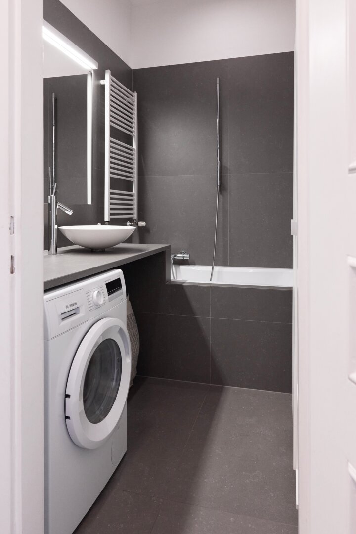 Badezimmer mit Badewanne und Anschluss für Waschmaschine