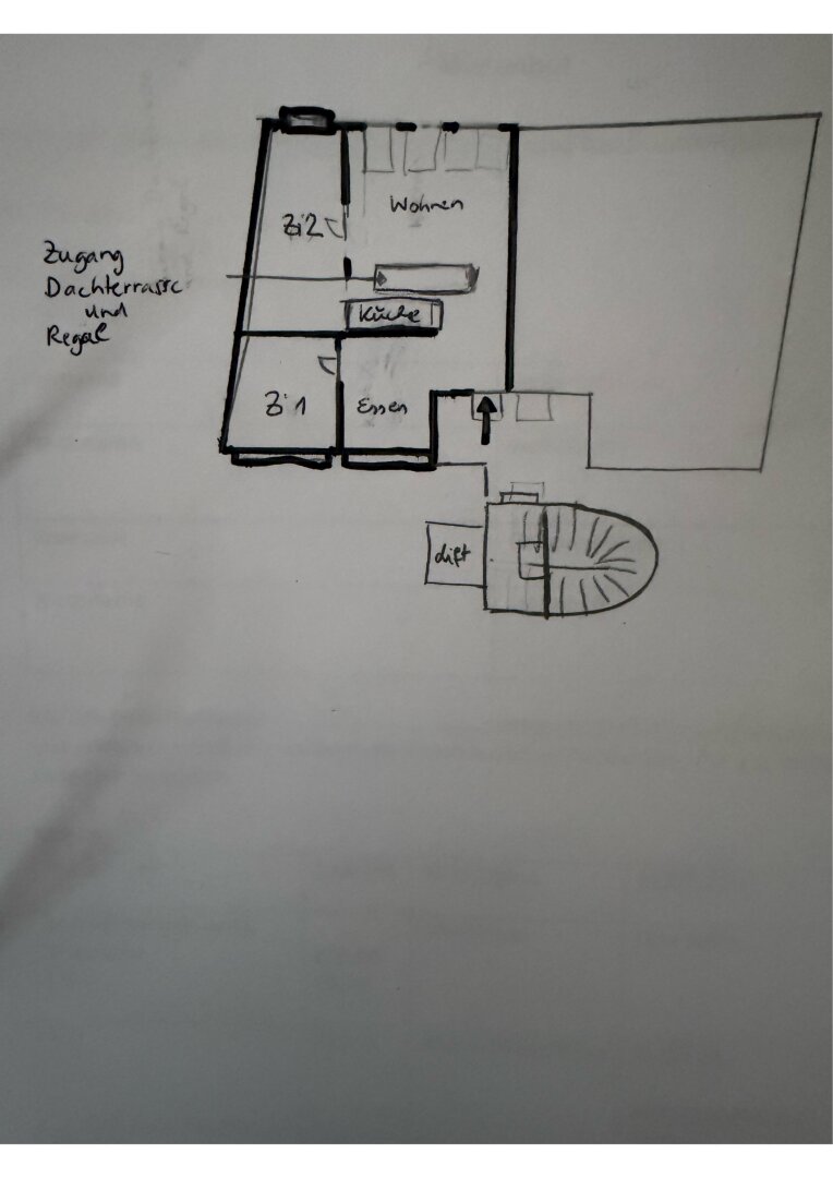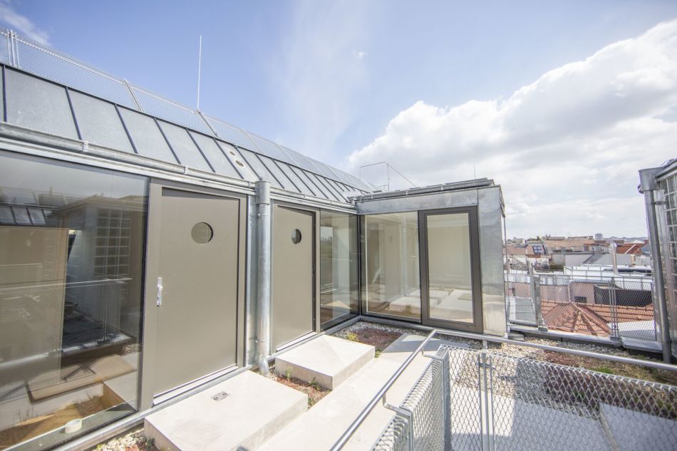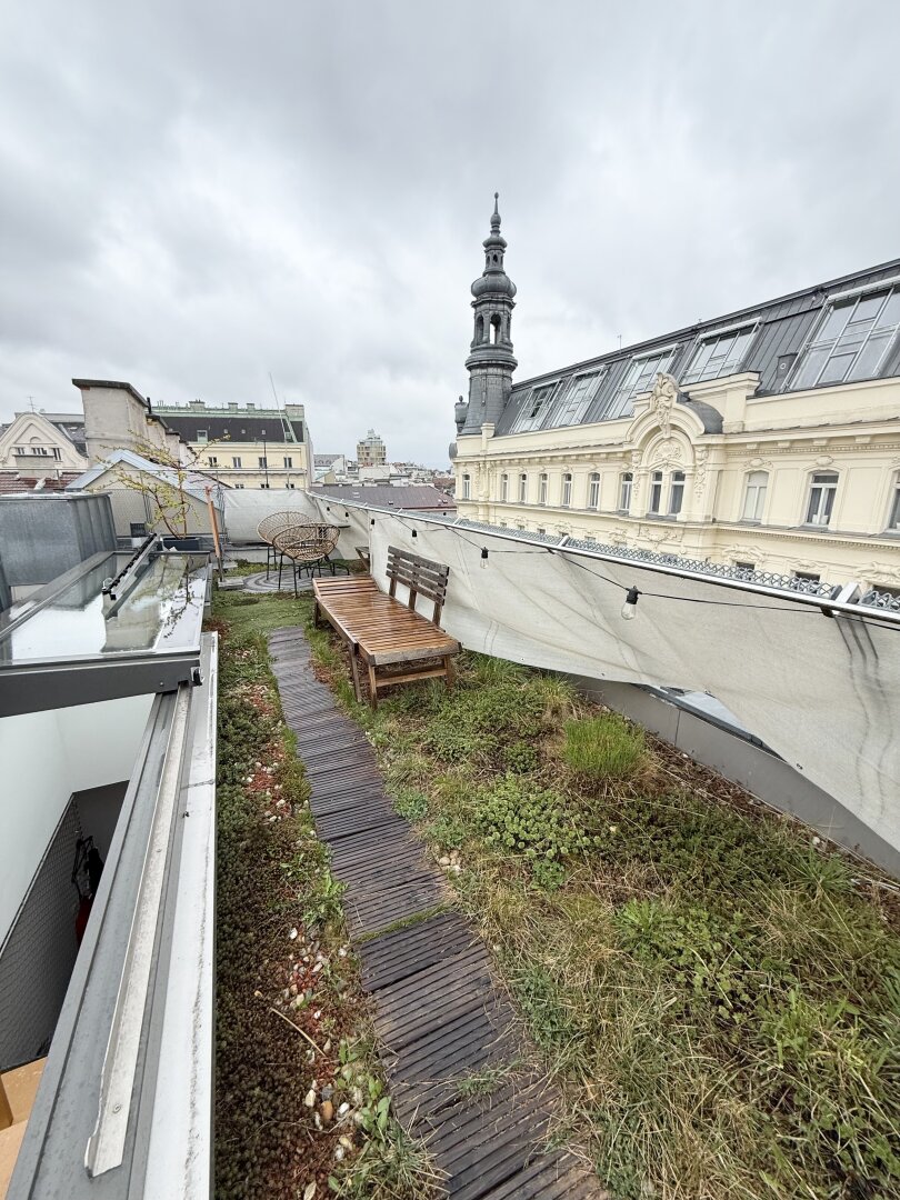 Die begrünte Dachterrasse im Dachgartengeschoß oberhalb der Wohnungen ist über die Raumsparstiege mit Antritt in der Nähe der Küchenzeile direkt erreichbar.