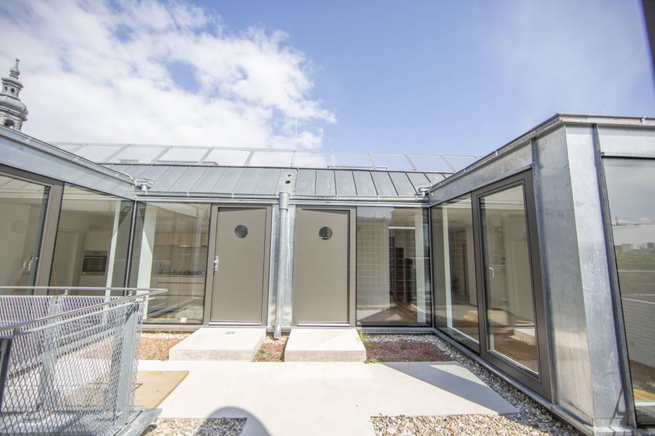 Dachgeschoßausbau mit penthouseartiger Wohneinheit im Dachgeschoß mit begrünter Dachterrasse oberhalb.