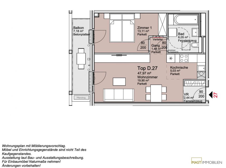 Die Wohnung befindet sich im 3. Liftstock und verfügt über 47,97 m² Wohnfläche + einen 7,18 m² großen Balkon.