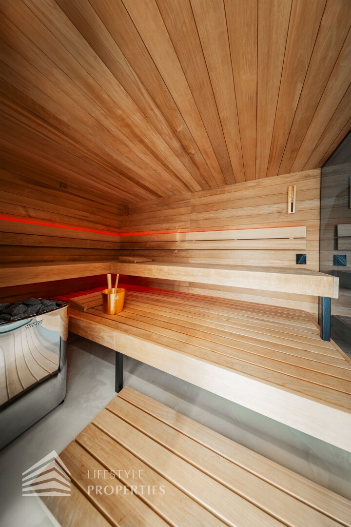 Der private Wellnessbereich bietet eine Sauna, einen Indoor-Jacuzzi für zwei Personen sowie einen großzügigen Outdoor-Jacuzzi für bis zu neun Personen. Der 8 x 5 Meter große Außenpool inklusive Reinigungsroboter, zwei bioklimatische Pergolen, eine voll ausgestattete Outdoor-Küche sowie eine repräsentative Gartensitzgruppe schaffen ein exklusives Ambiente für stilvolle Empfänge oder entspannte Stunden im privaten Refugium.