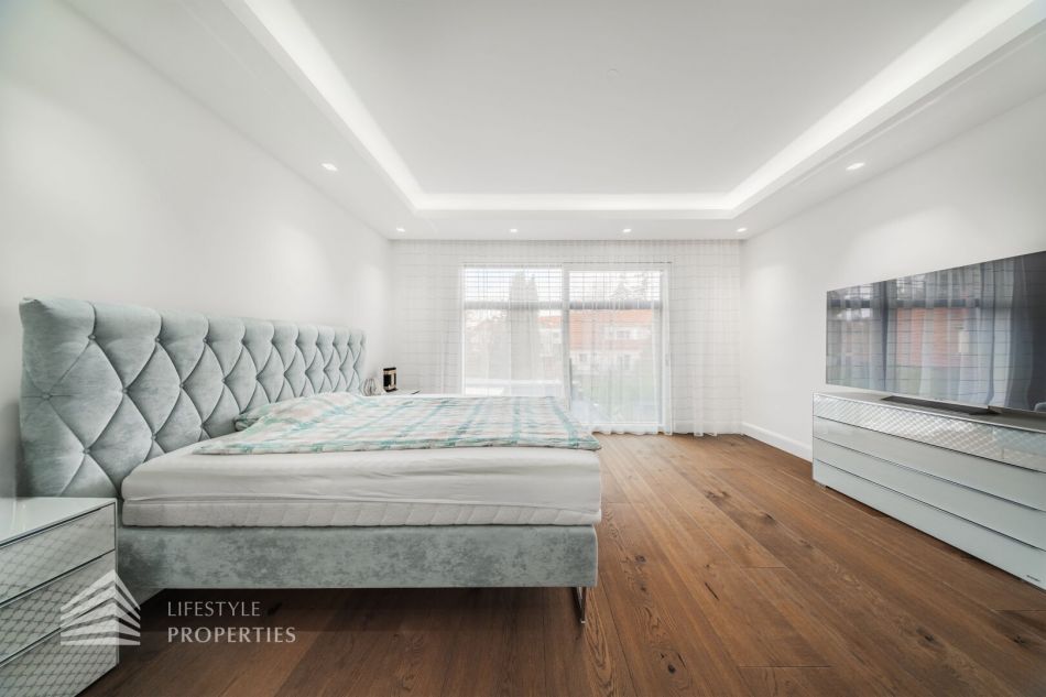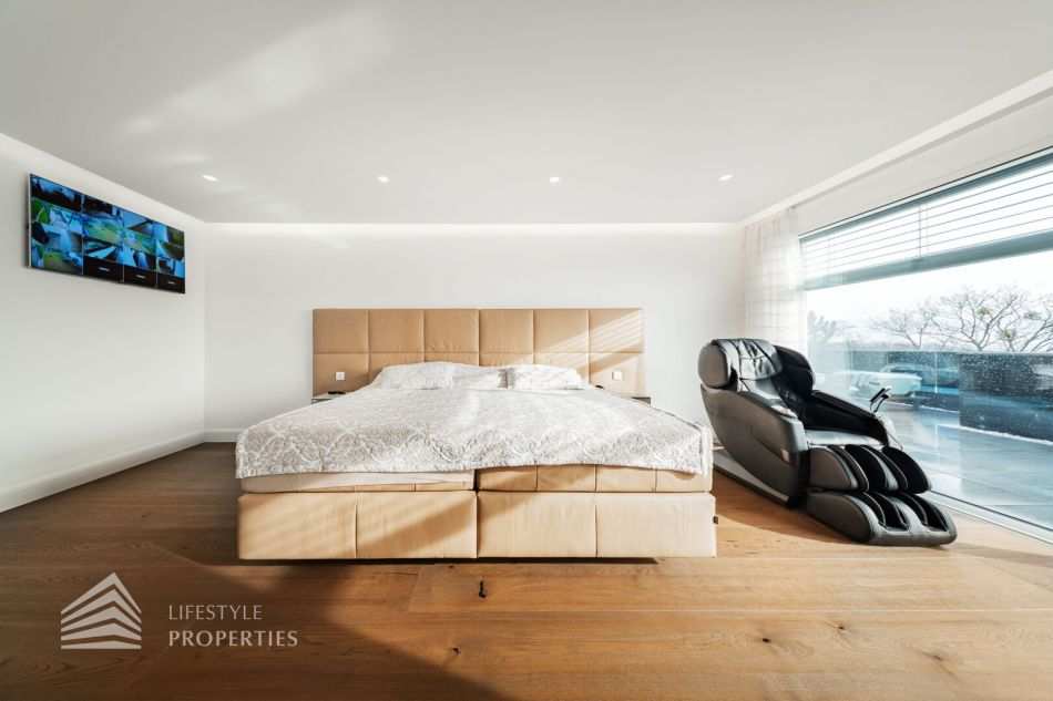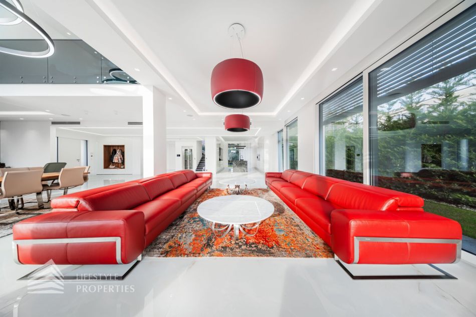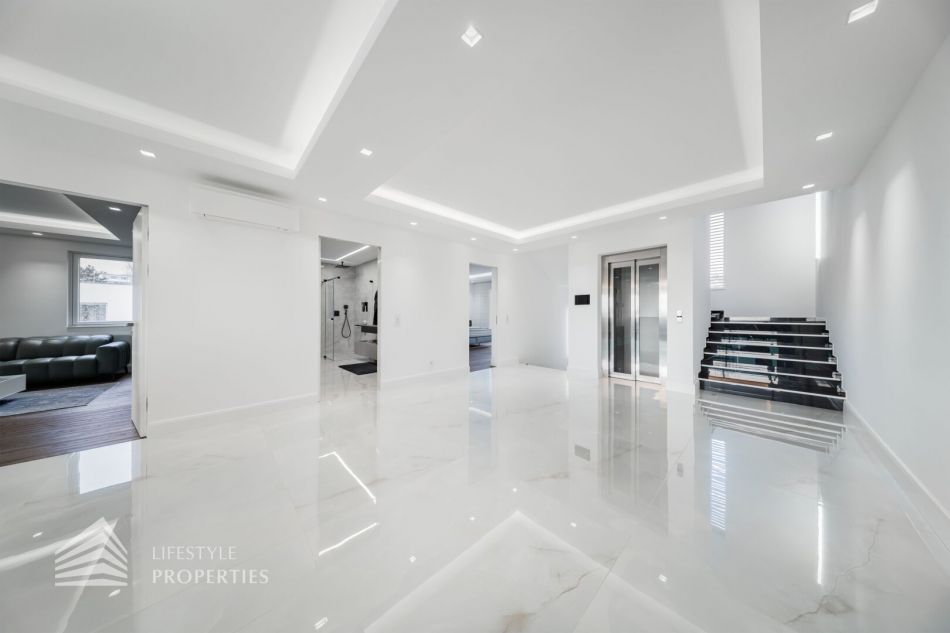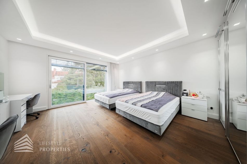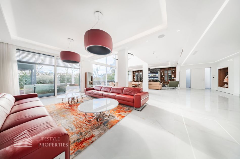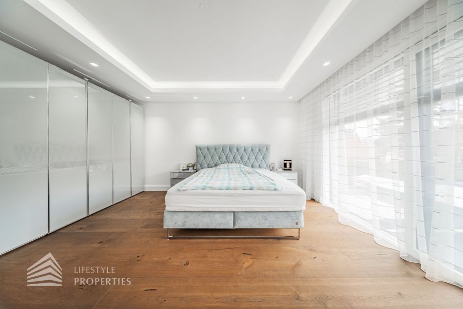 Mit insgesamt acht großzügig dimensionierten Zimmern eröffnet die Villa vielfältige Nutzungsmöglichkeiten – von repräsentativen Wohnsalons über exklusive Master-Suiten bis hin zu stilvollen Office- oder Gästebereichen. Die Architektur folgt einer klaren, zeitlosen Formensprache und setzt auf Licht, Raumwirkung und hochwertige Materialien in internationaler Qualität.