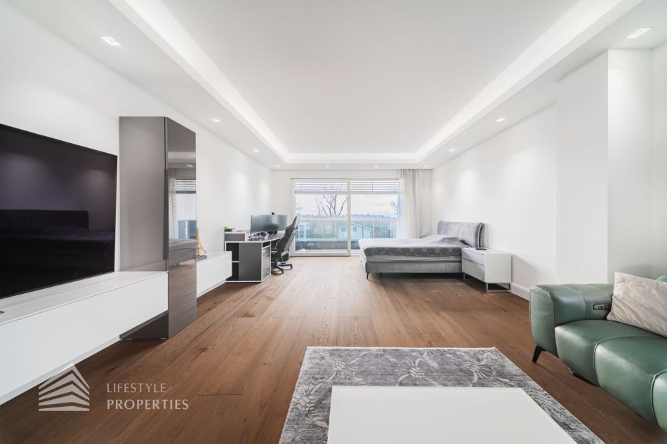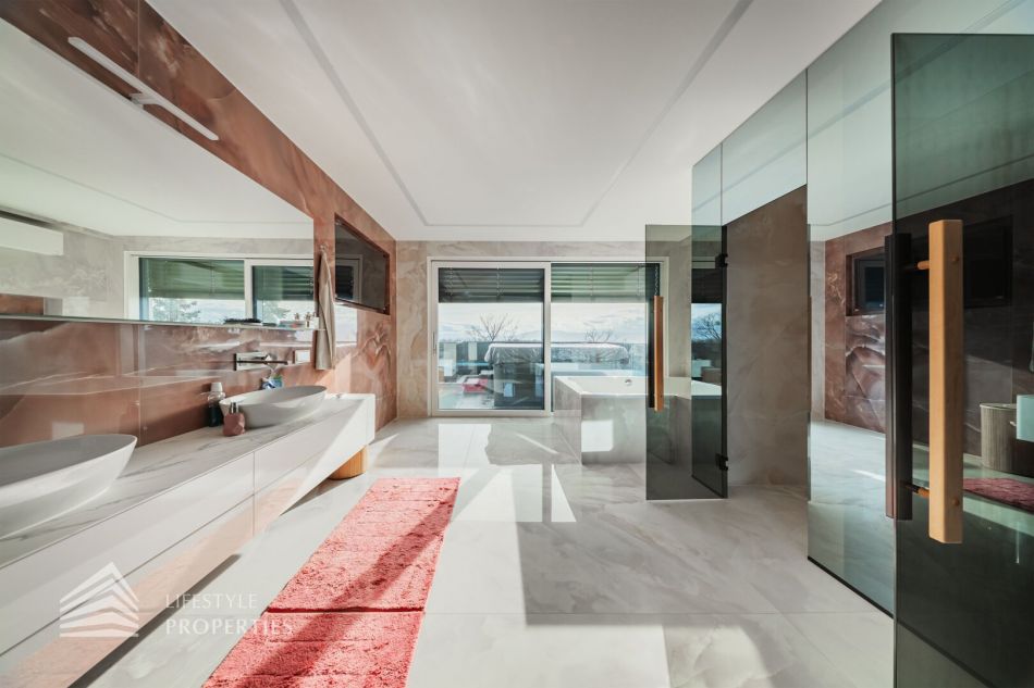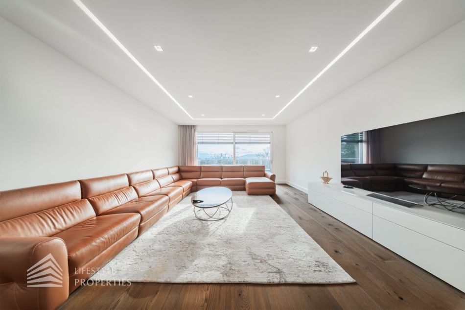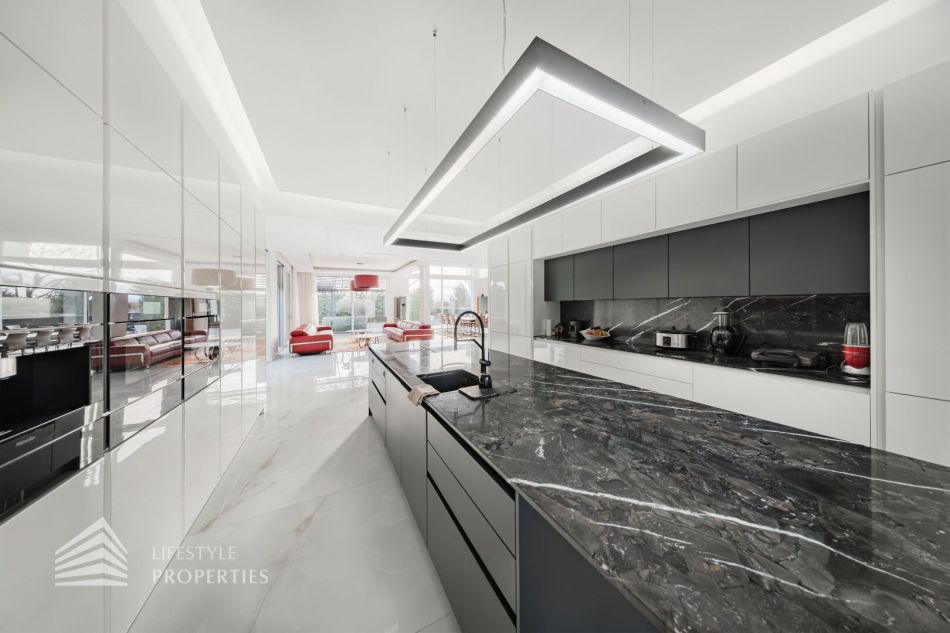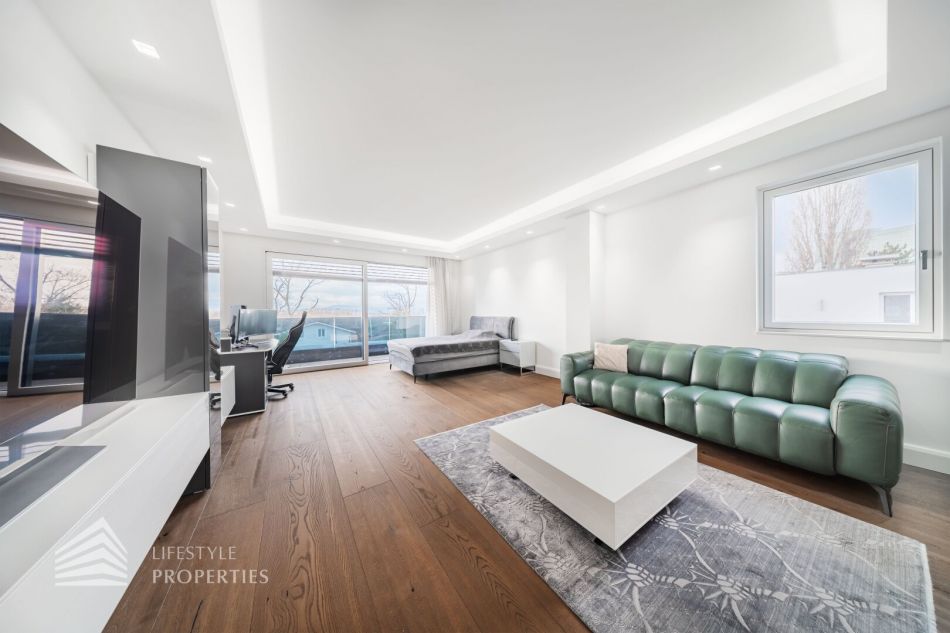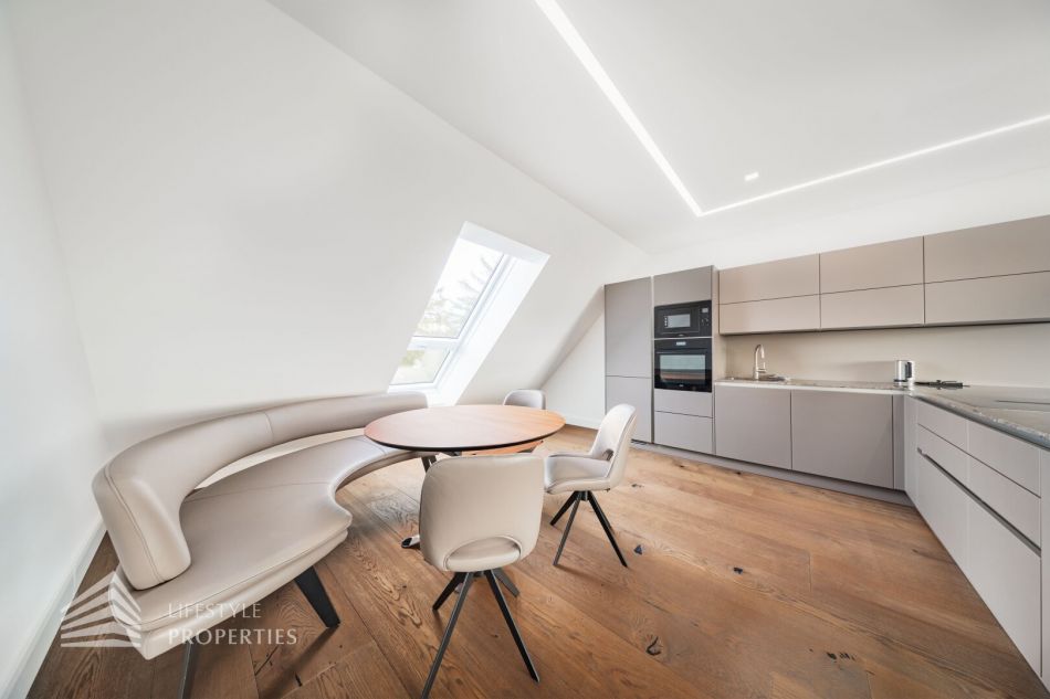 Im Innenbereich verschmelzen edelste Materialien zu einem harmonischen Gesamtbild. Fenster- und Portalsysteme von Josko mit elektrischen Raffstores, maßgefertigtes Schweizer Sonderparkett in 2,5 cm Stärke sowie großformatige italienische Designfliesen im Format 1,5 x 3 Meter setzen ein klares Zeichen kompromissloser Qualität. Zwei exklusive Designküchen mit internationalen Markenmöbeln von Natuzzi und Joop! unterstreichen den gehobenen Lifestyle-Charakter dieser Residenz.