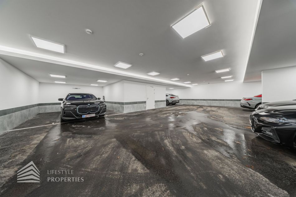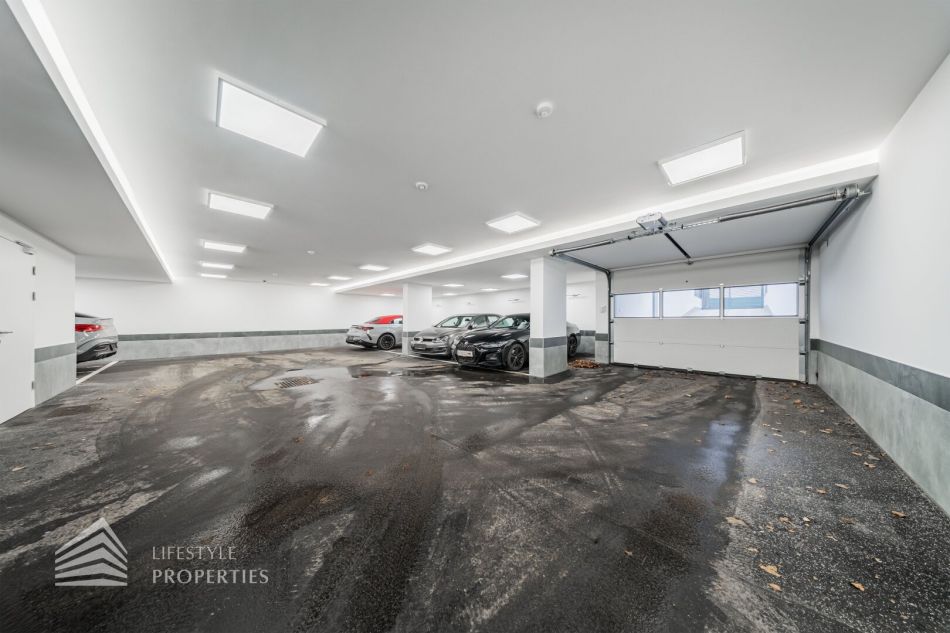 Bereits die Ankunft unterstreicht die Exklusivität dieses Anwesens: Eine außergewöhnlich großzügige Tiefgarage mit Platz für bis zu acht Fahrzeuge inklusive zweier E-Ladestationen bietet eine in Wien seltene Dimension. Der elegante Lift mit transparenter Glastüre von KONE verbindet sämtliche Ebenen komfortabel und stilvoll.