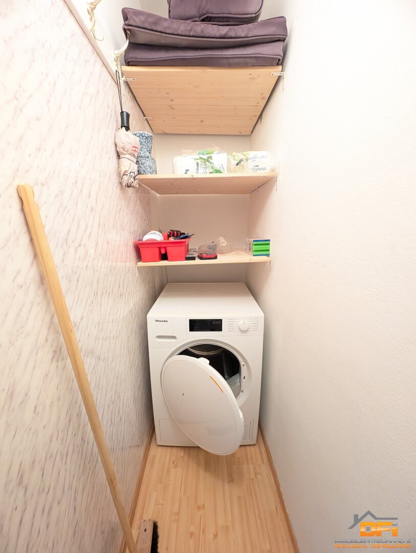 Der Abstellraum ist mit einem Regal ausgestattet und bietet ausreichend Stauraum.