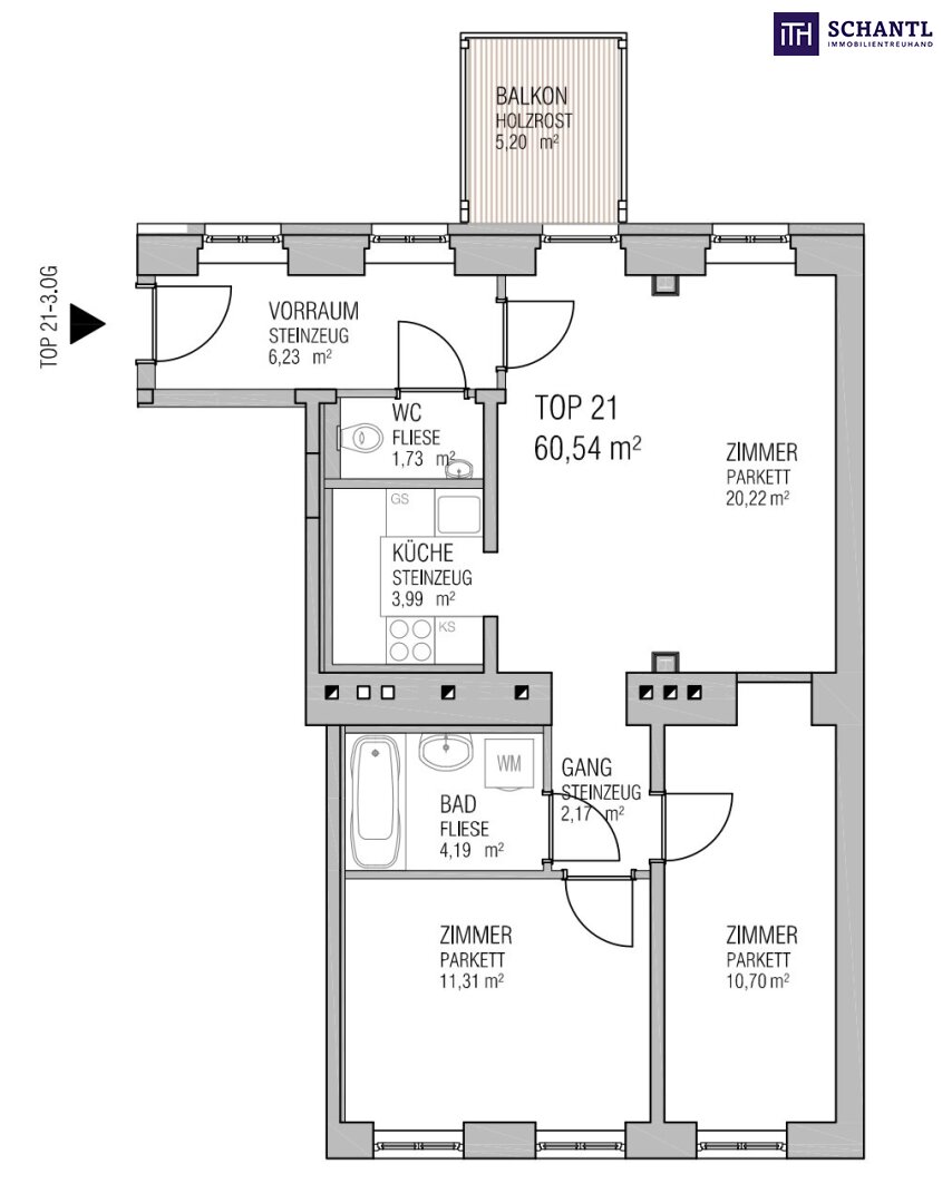 Wohnfläche: ca. 60,54m² + Balkon: ca. 5,20m² + Kellerabteil