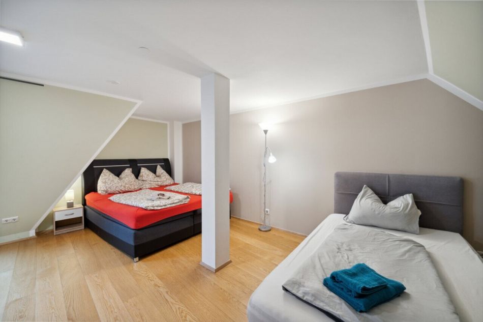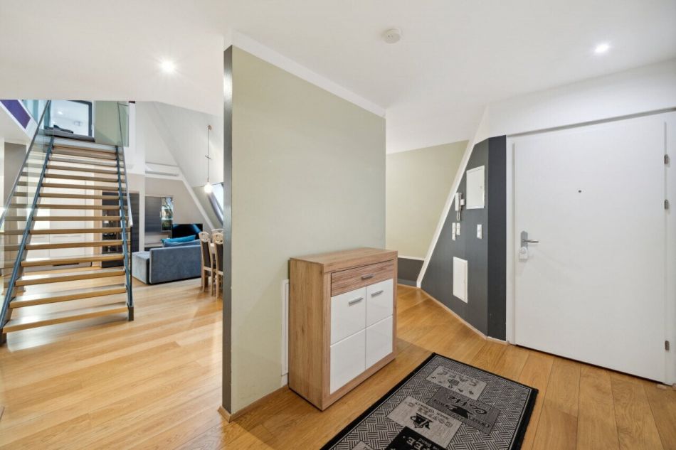 Über die Stiege inmitten des Raumes gelangen Sie in das obere Stockwerk der Wohnung. Dort befindet sich eine offen gestaltete Galerie, die sich vielseitig nutzen lässt. Zu beachten ist, dass dieser Bereich offen gestaltet ist und nicht durch eine Tür abgetrennt ist! Zusätzlich steht ein weiteres, durch eine Tür abgetrenntes Zimmer mit ca. 31 m² zur Verfügung.