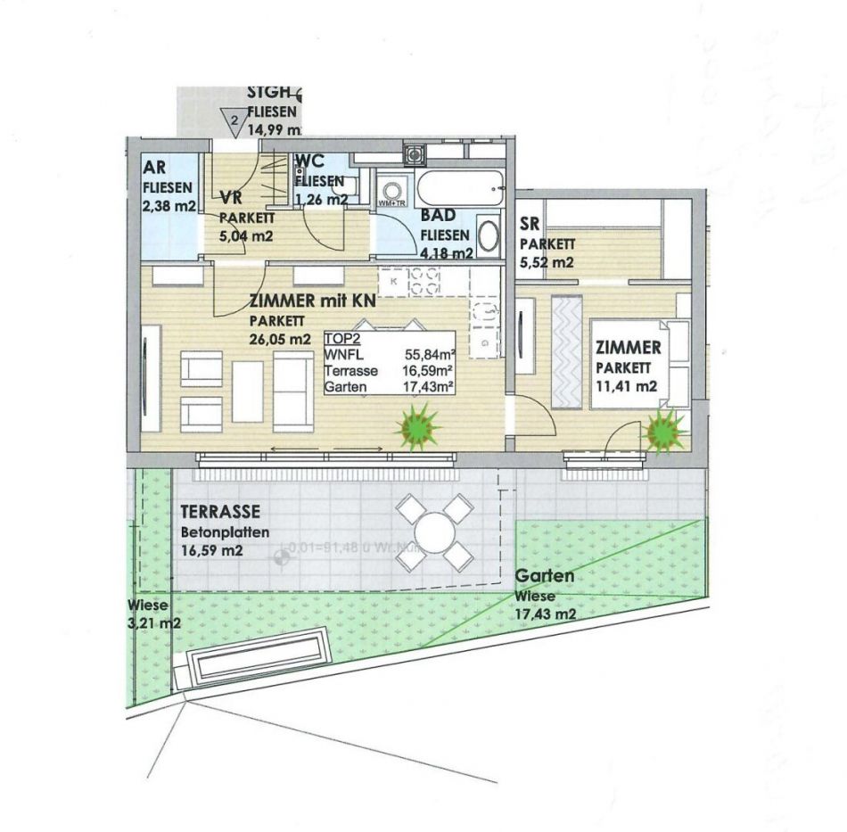 Die Wohnung hat eine Wohnfläche von 56 m2, ca. 17 m2 Gartenfläche und ca. 16 m2 Sonnenterrasse.