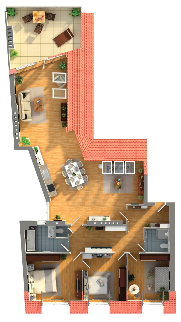 Dank durchdachter Raumaufteilung bietet die Wohnung bis zu drei Schlafzimmer, zwei Bäder sowie ausreichend Stauraum.