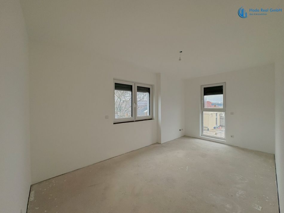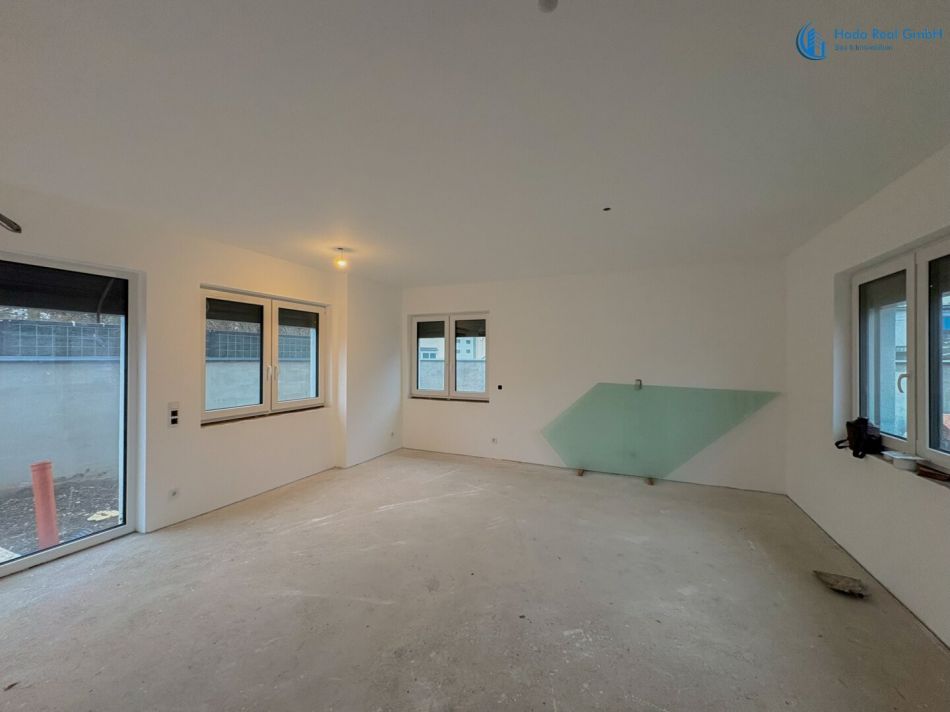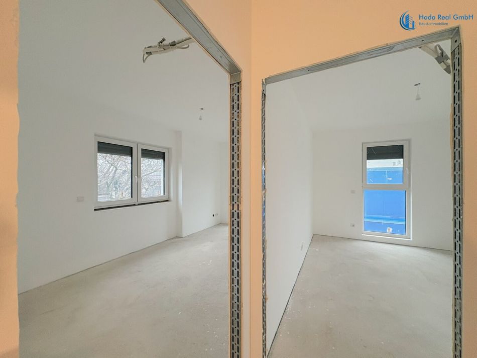 Die Häuser sind baulich vollständig fertiggestellt. Die Außenanlagen sowie der Rohbau inklusive Fenster, Haustechnik und Gebäudehülle sind abgeschlossen.