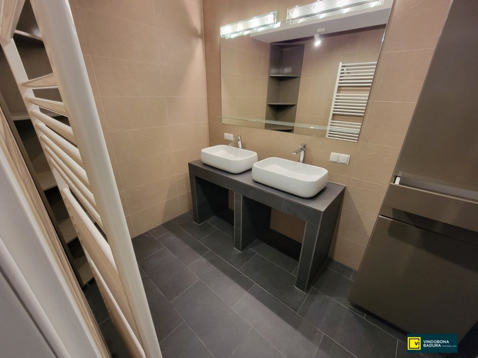 Das komplett verflieste Badezimmer beinhaltet zwei Waschbecken, einen sehr großen, offenen Duschbereich, Handtuchtrockner,