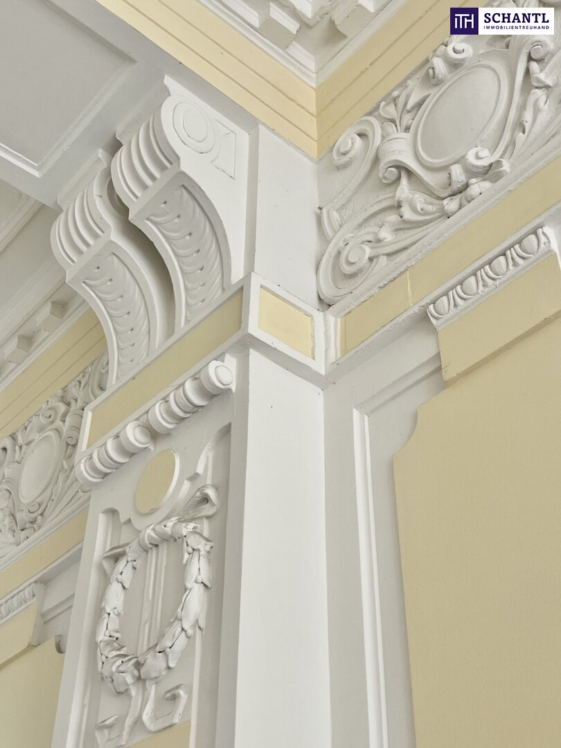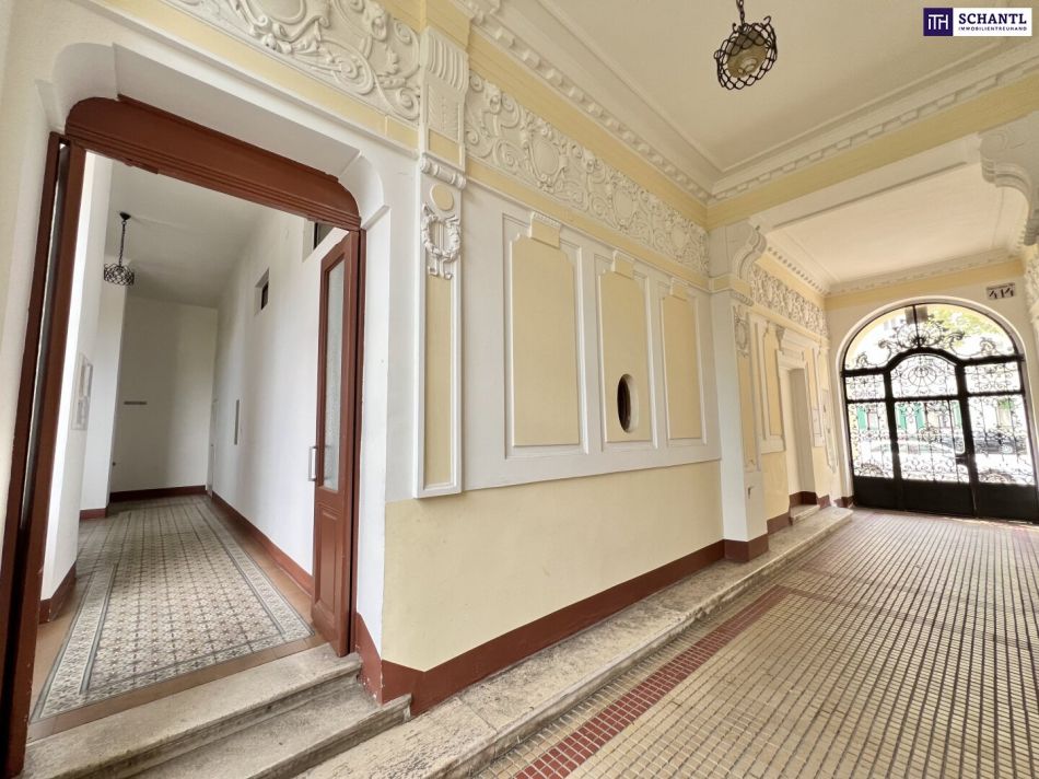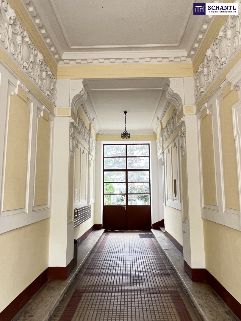 Das eindrucksvolle Eingangsportal und das liebevoll erhaltene Stiegenhaus mit originalem Schmiedeeisengeländer schaffen ein unverwechselbares Ambiente – ein Gefühl, stilvoll nach Hause zu kommen, das jeden Tag bleibt.