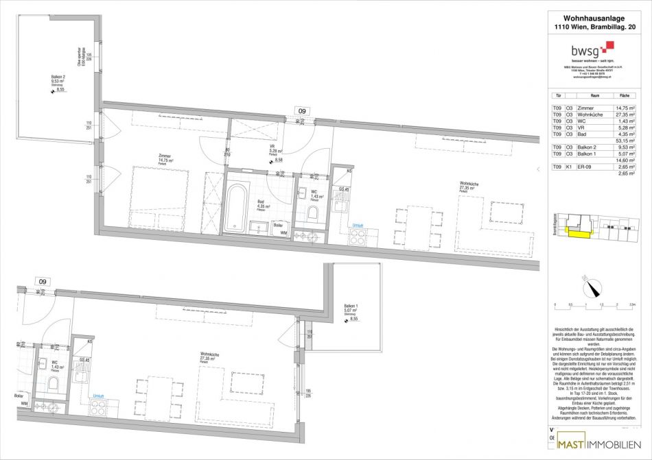 Die Wohnung befindet sich im 3. Liftstock und verfügt über 53,15 m² Wohnfläche + zwei Balkone mit insgesamt 14,60 m².