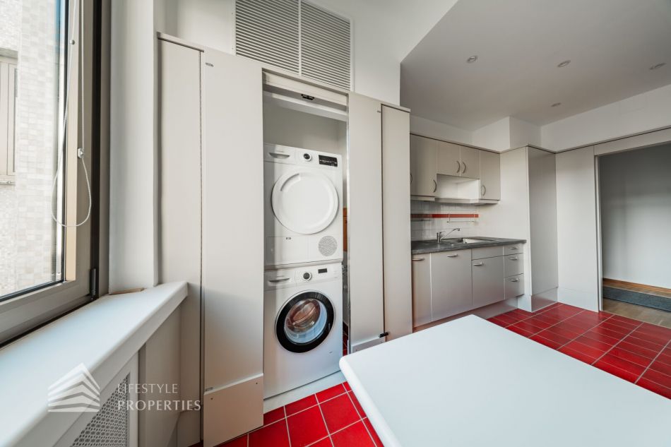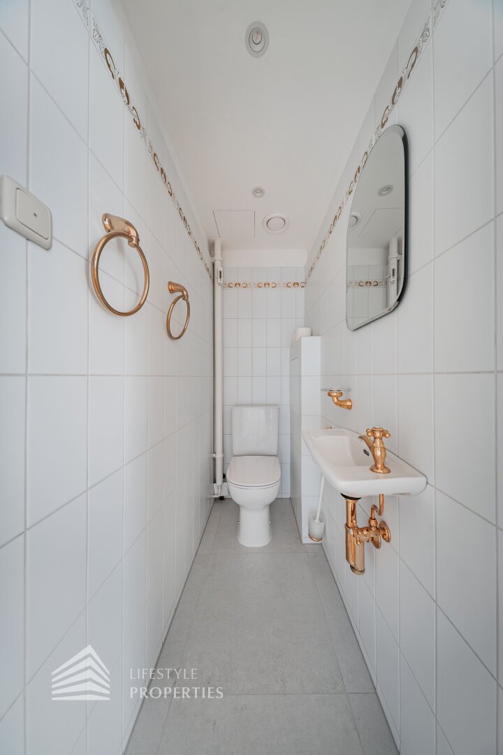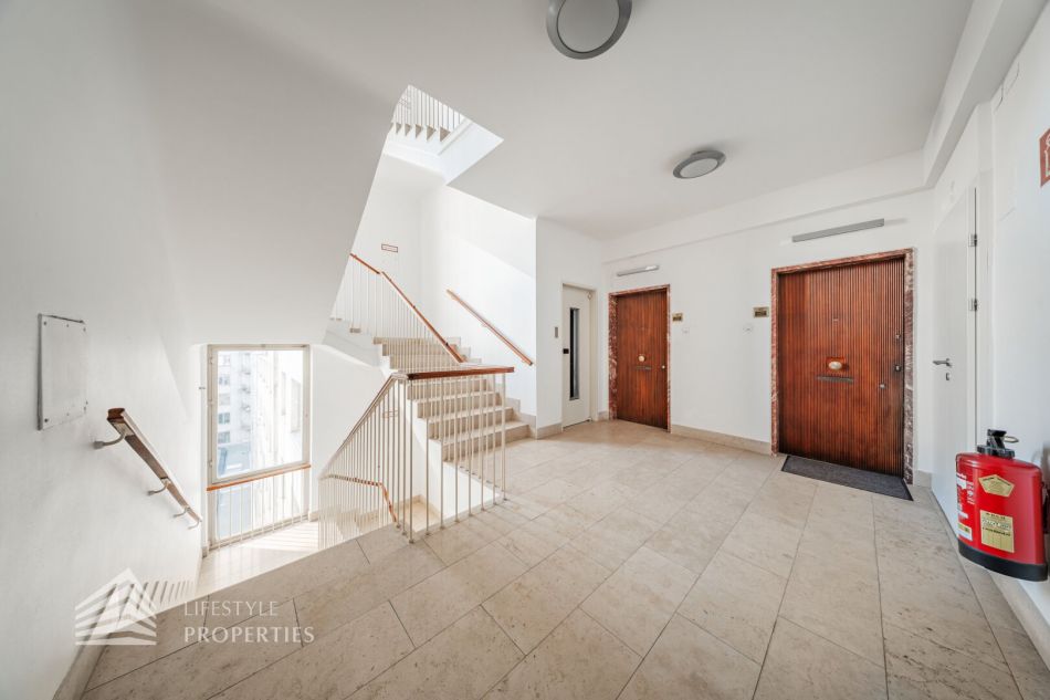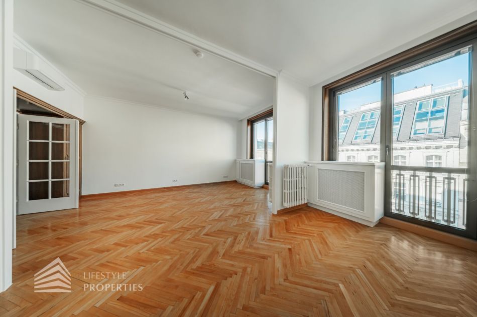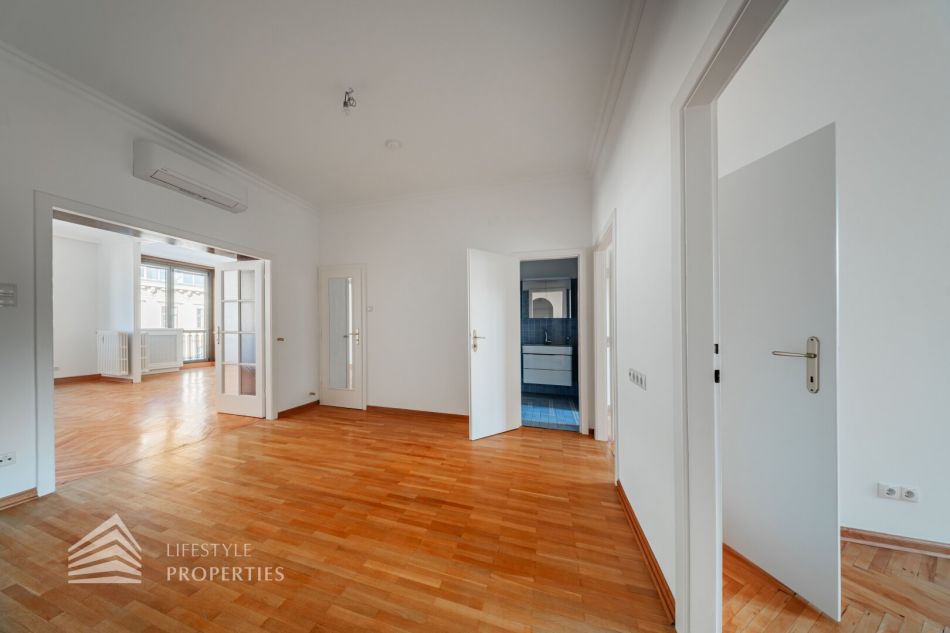 Der hofseitige Teil der Wohnung bildet das Herzstück: Zwei weitläufige Räume, die zu einem ca. 35 m² großen Wohnzimmer verbunden sind und eine absolute Ruhelage genießen. Dieser Bereich eignet sich perfekt als stilvoller Wohn- und Entspannungsbereich inmitten des pulsierenden Stadtzentrums. Sowohl der große Vorraum als auch das Wohnzimmer sind mit Klimaanlagen ausgestattet, die für angenehmes Raumklima zu jeder Jahreszeit sorgen.