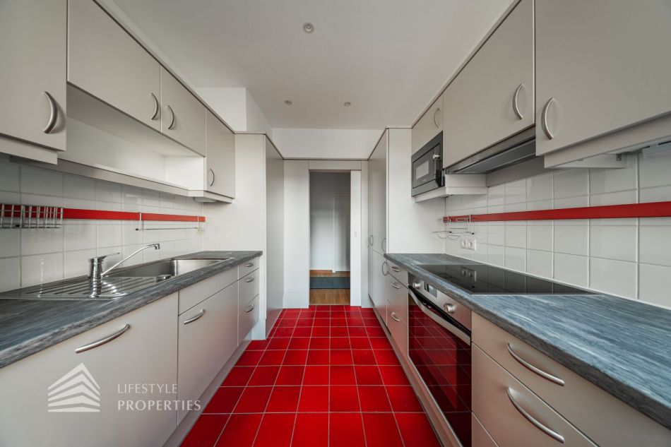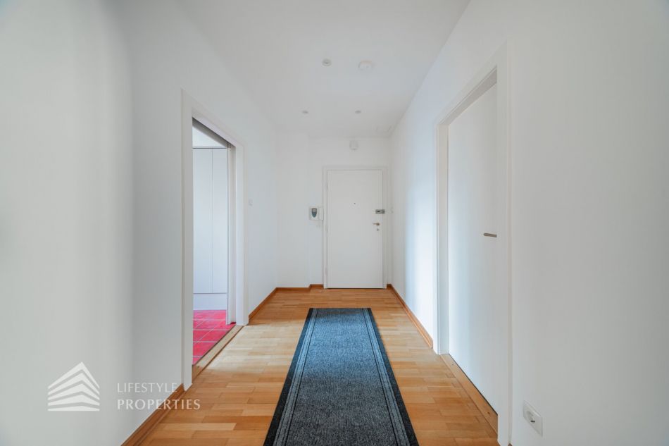 Beim Betreten der Wohnung eröffnet sich ein rund 7 m² großer Vorraum, der den Zugang zu allen Bereichen der großzügig geschnittenen Wohnfläche vermittelt. Rechterhand befindet sich die separate, voll ausgestattete Küche mit hochwertigen Geräten und einer praktischen, angrenzenden Waschmaschinen- und Trocknerkammer. Der gesamte Küchenbereich umfasst etwa 10 m² und ist ideal strukturiert. Linkerhand der Eingangstüre bietet eine ca. 3,5 m² große Abstellkammer wertvollen zusätzlichen Stauraum. Im Anschluss gelangt man in einen beeindruckend knapp 13 m² großen zentralen Vorraum, der vielseitige Nutzungsmöglichkeiten eröffnet – ob als Essbereich, Home-Office, Garderobenlounge oder stilvolle Empfangszone.