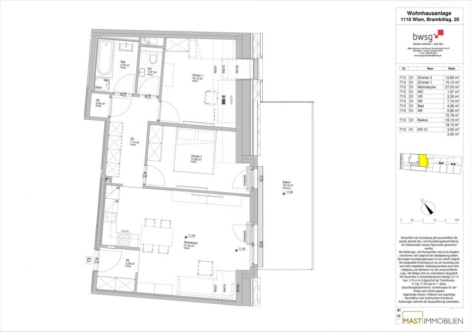 Die Wohnung befindet sich im 4. Liftstock (1. Dachgeschoss) und verfügt über 72,79 m² Wohnfläche + einen 18,15 m² großen Balkon.