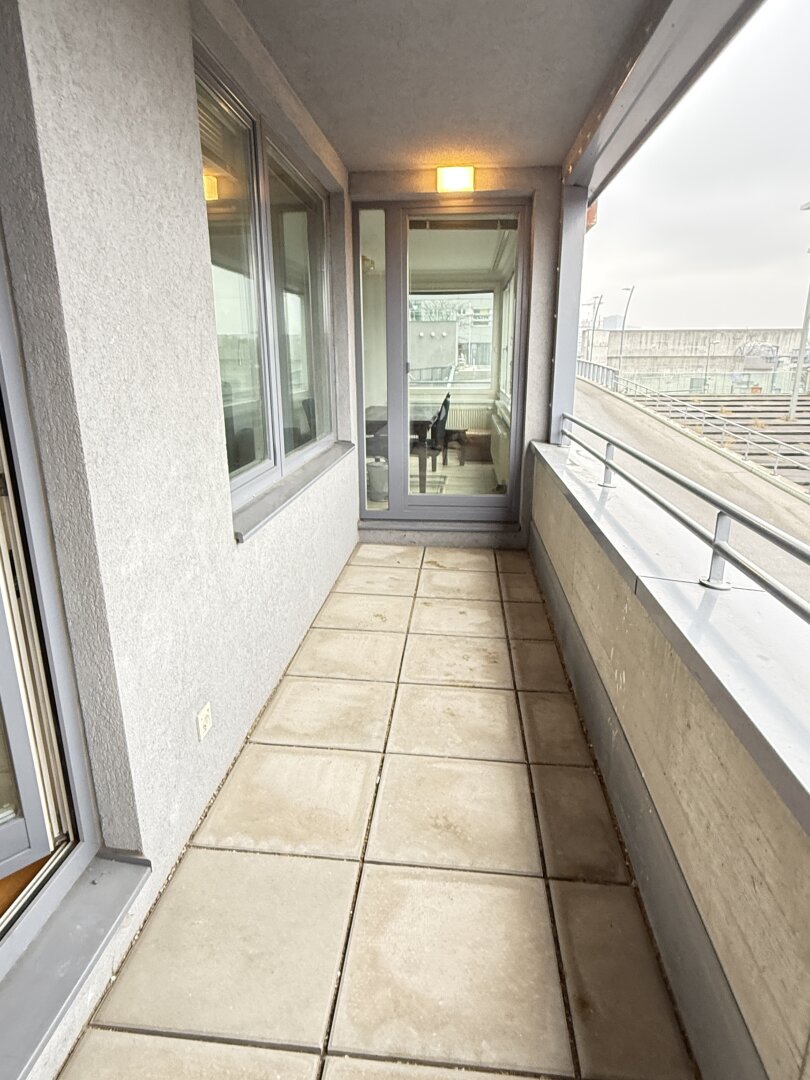Die Loggia verläuft länglich entlang der Wohnung und hat knappe 8 m2.