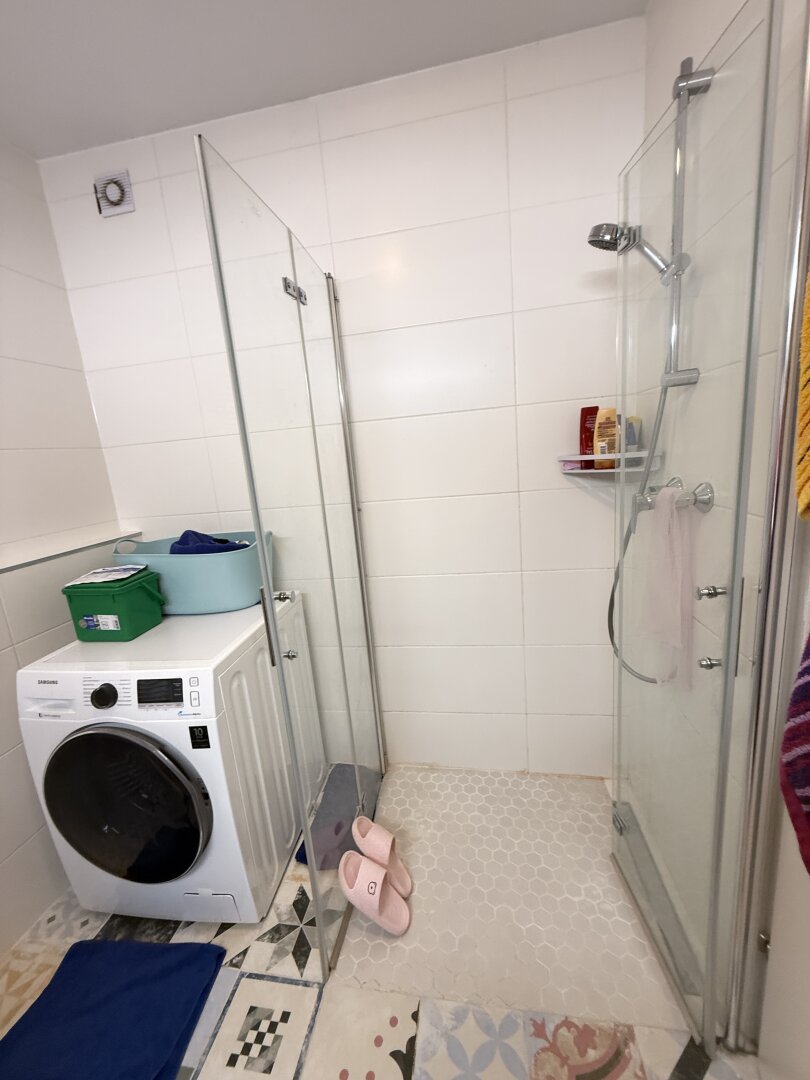 Das Bad ist mit einer Dusche und Waschmaschine ausgestattet. Die Toilette liegt separat nebenan.