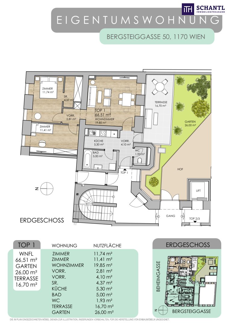 + TOP 1 / EG: Wohnfläche: ca. 66,51m² + Terrasse: ca. 16,70m² + Garten: ca. 26m² / 3 Zimmer / € 405.000.-