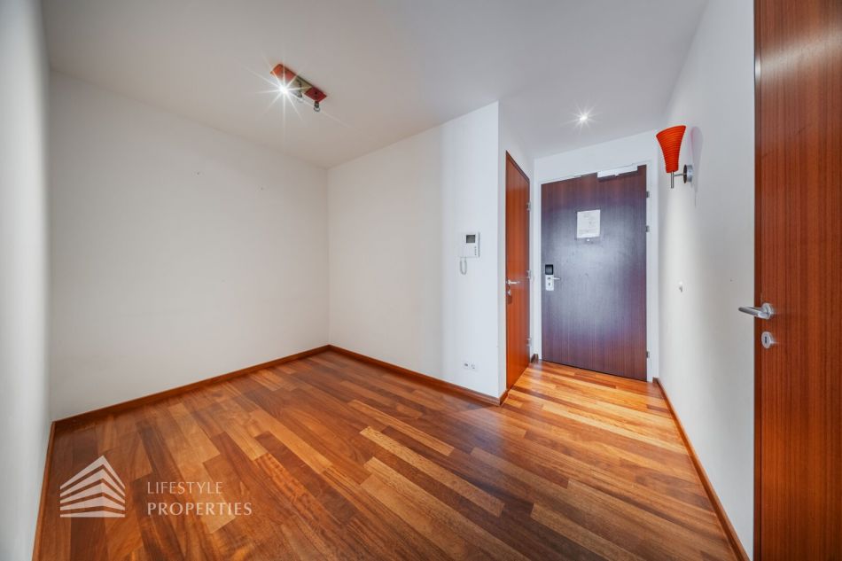 Die Haupträume der Wohnung sind mit Parkett ausgekleidet, in den Nassräumen sind moderne Fliesen verlegt.
