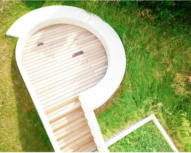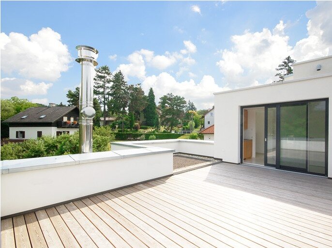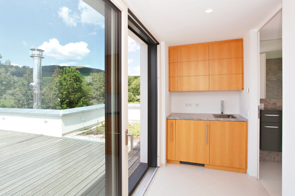 Im Dachgeschoss - ebenfalls mit dem barrierefreien Personenlift, der dezent hinter einer weißen Tür verborgen ist, erreichbar - befindet sich neben einer wunderschönen, sonnigen Dachterrasse von 28 m2 (zuzüglich ca. 9 m2 Fläche für ein Outdoor-Pool) eine Toilette und eine kleine Teeküche. Ein Abend auf der Terrasse mit einem spannenden Film oder die Fußball-WM mit Freunden genießen? Kein Problem - die Sonnenterrasse ist mit einem Fernseh- und Internetanschluss ausgestattet und kann problemlos als Freiluft-Kino genutzt werden.