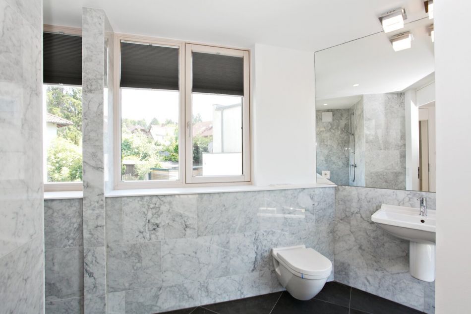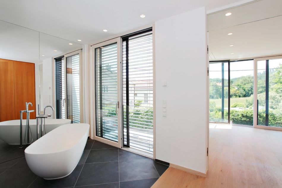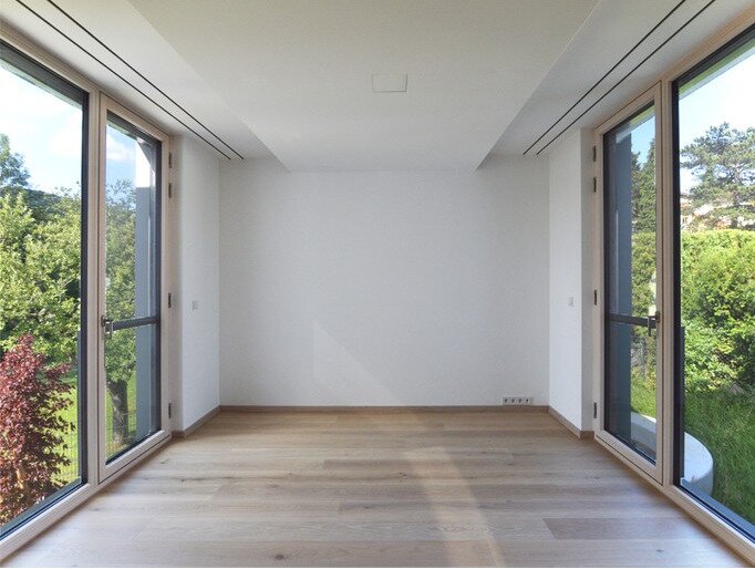 Im 1. Stockwerk befinden sich sehr großzügig angelegte, lichtdurchflutete Schlafräume mit dezent verbauten, eigens beleuchteten Einbauschränken. Jedes der 3 Schlafzimmer hat ein Bad-en-Suite (das Masterbadezimmer mit freistehender Badewanne und Blick in den angrenzenden Wienerwald), bietet einen großen Komfort und geht auf die individuellen Bedürfnisse aller Familienmitglieder ein. Auch hier wurden wieder extravagante, modern architektonische Lösungen für die Badezimmer-Ausstattung gewählt.