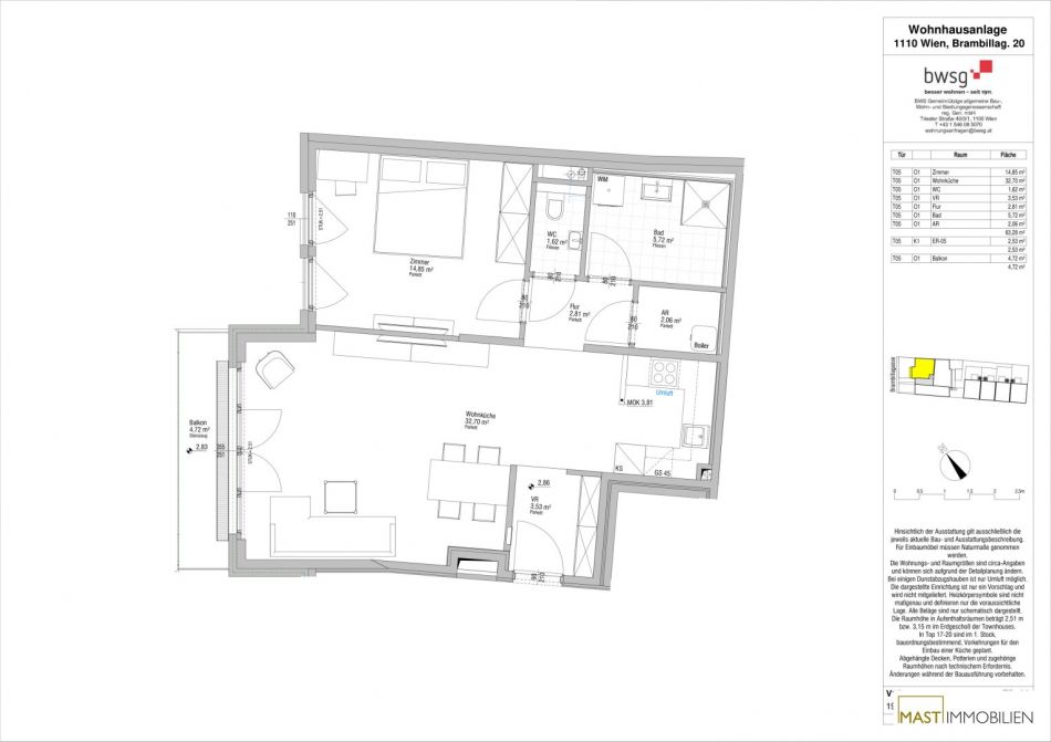 Die Wohnung befindet sich im 1. Liftstock und verfügt über 63,28 m² Wohnfläche + einen 4,72 m² großen Balkon.