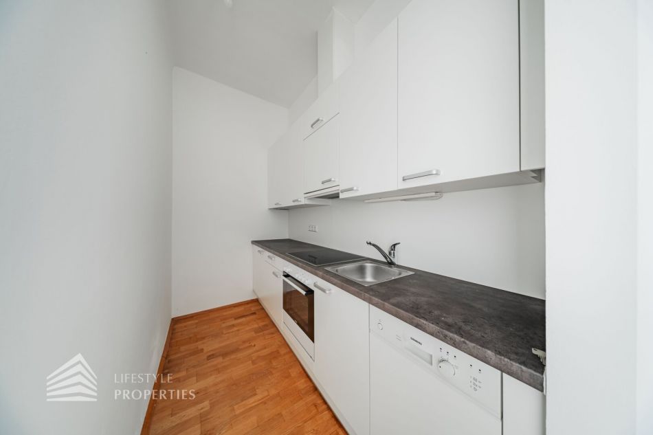 Rechter Hand befindet sich das ca. 10 m² große Schlafzimmer, das in einen ruhigen Innenhof ausgerichtet ist und so erholsamen Schlaf inmitten der Stadt gewährleistet. Ebenfalls zur rechten Seite liegt die separate, voll ausgestattete Küche, die funktionale Arbeitsbereiche mit klassischem Stil verbindet und ausreichend Platz für kulinarische Kreativität bietet.