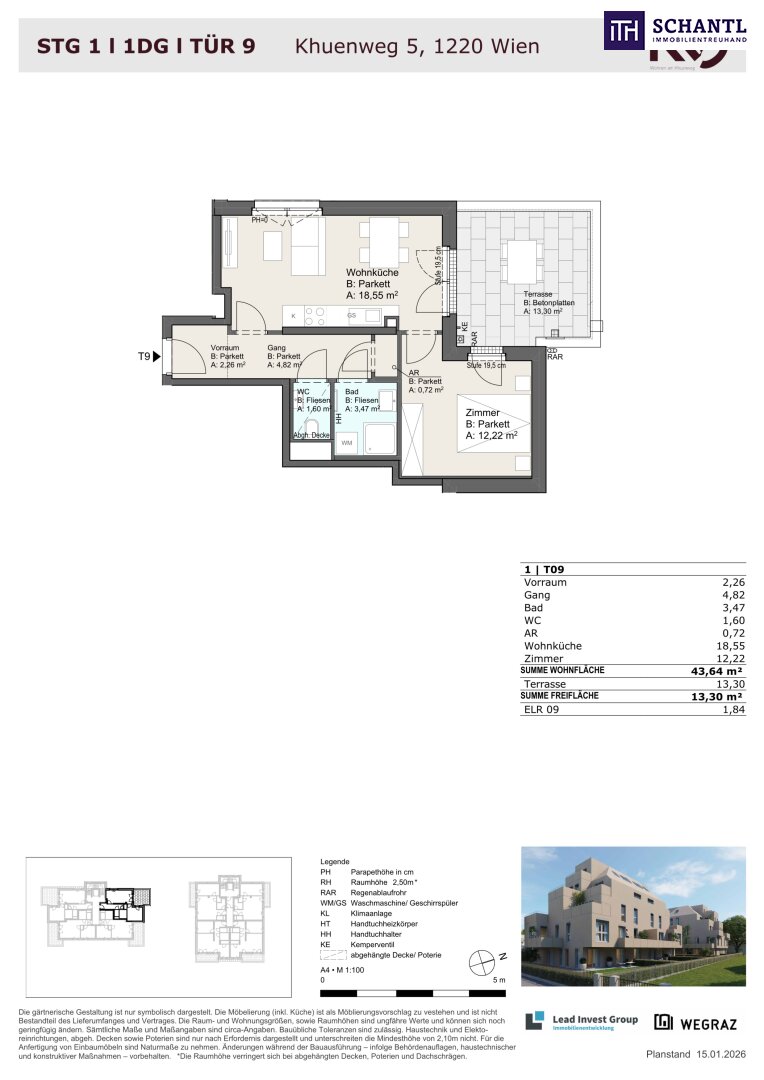 Wohnfläche: ca. 43,64m² + Terrasse: ca. 13,30m² + Kellerabteil: ca. 1,84m²