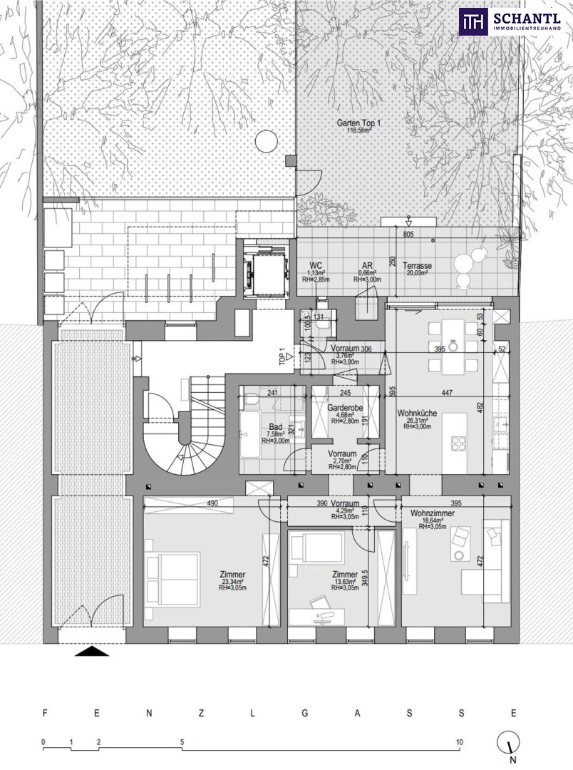 Wohnfläche: ca. 106,73m² + Terrasse: ca. 20,03m² + Eigengarten: ca. 116,56m² + Kellerabteil: ca. 3,53m²