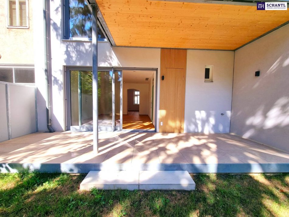 Vom Wohnzimmer gelangen Sie auf die große Terrasse mit Wasser- Licht- und Stromanschluss und einem raffinierten Abstellraum sowie zum herrlichen Eigengarten!