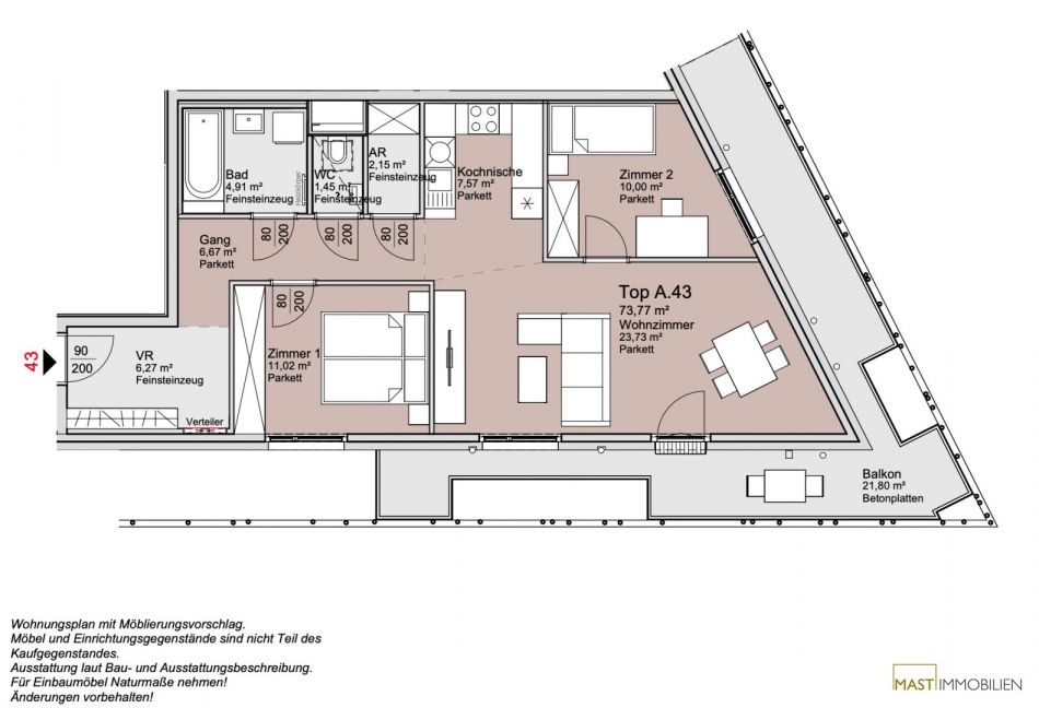 Die Wohnung befindet sich im 7. Liftstock und verfügt über 73,77 m² Wohnfläche + einen 21,80 m² großen Balkon.
