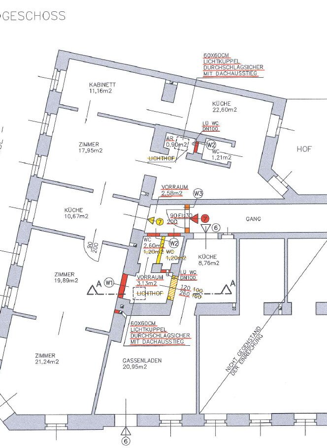 Das Objekt, welches im Erdgeschoss liegt, umfasst insgesamt ca. 35,24 m². Über die gesamte Höhe und Breite der Frontseite ist eine Auslage vorhanden. Sie betreten das Lokal gassenseitig und gelangen sofort in den größten Raum mit ca. 20,95 m². Hier befinden sich sowohl ein Fenster zur Straßenseite. als auch eine 60x60 cm Lichtkuppel mit durchschlagsicherem Glas. Im hinteren Bereich des Lokals befindet sich eine Küche mit ca. 8,76 m² mit anschließender Türe in das Stiegenhaus. Des Weiteren gibt es zusätzlich einen kleinen Vorraum mit einer Lichtkuppel durch diese man zur Toilette gelangt.