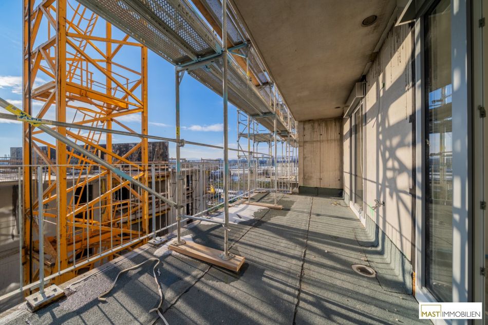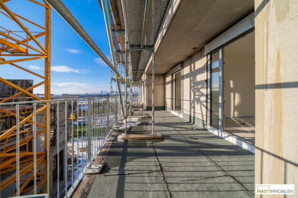 Die Wohnung befindet sich im 3. Liftstock und verfügt über 65,69 m² Wohnfläche + einen 7,66 m² großen Dachgarten + eine 18,46 m² große Terrasse + eine 23,05 große südlich ausgerichtete Loggia/Balkon.