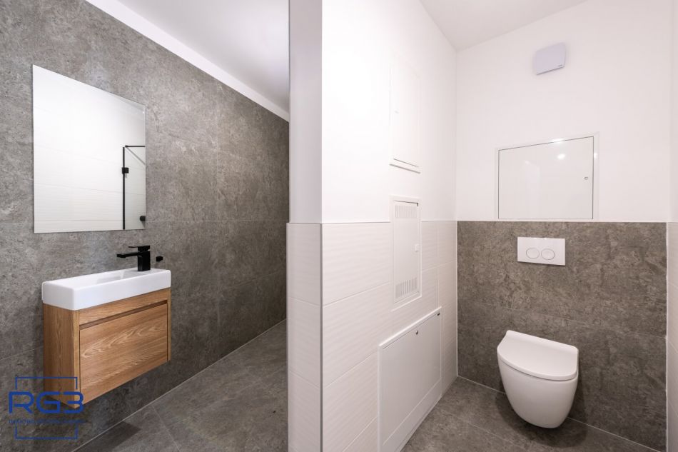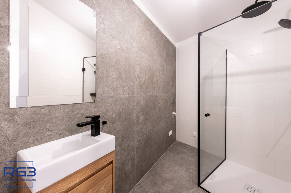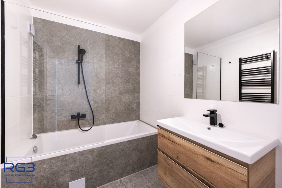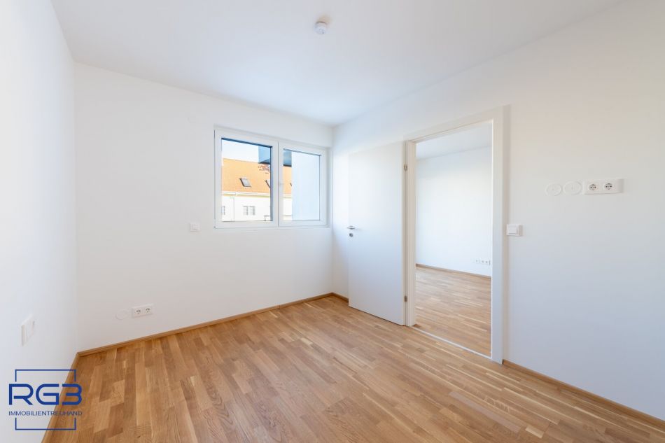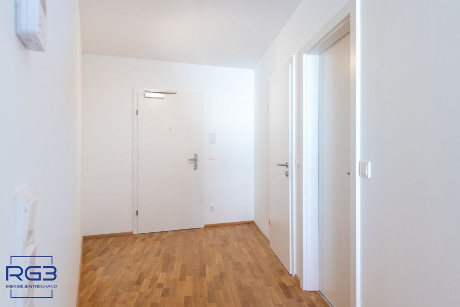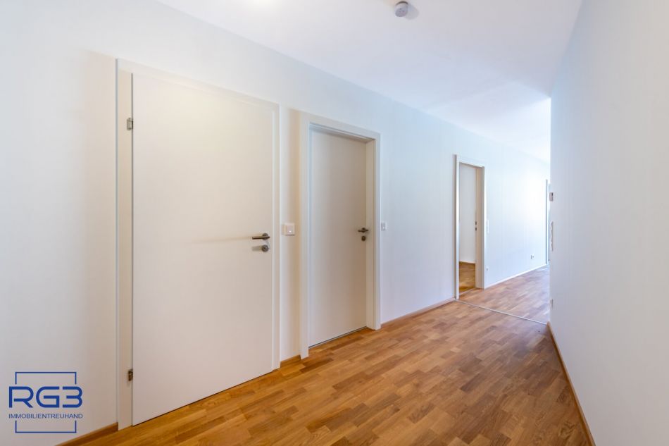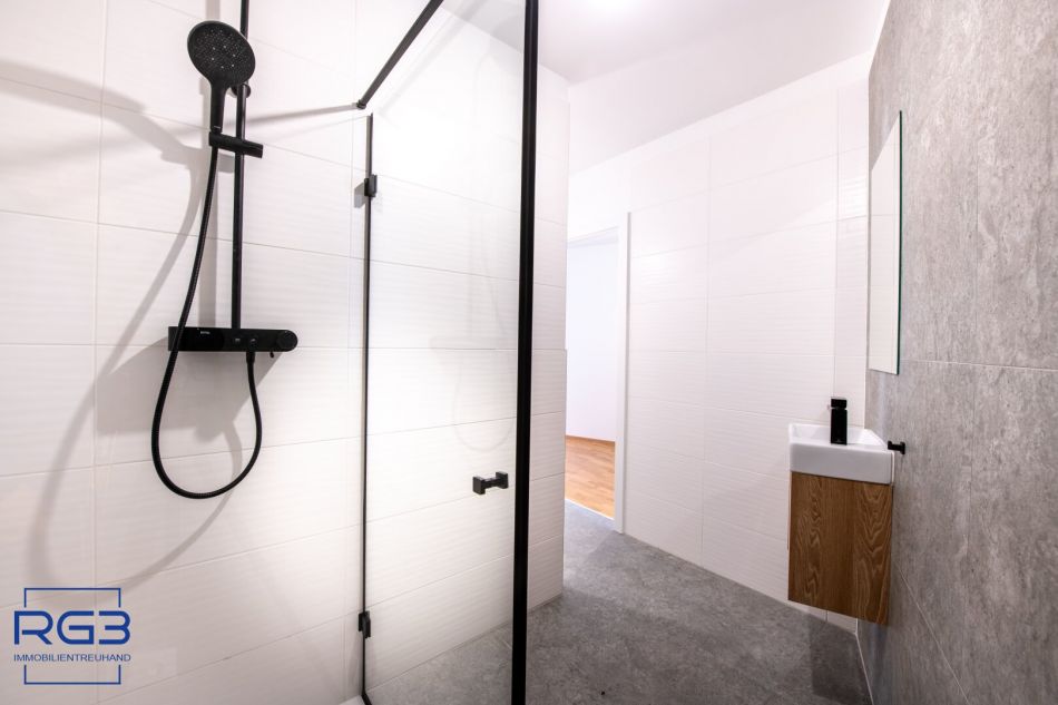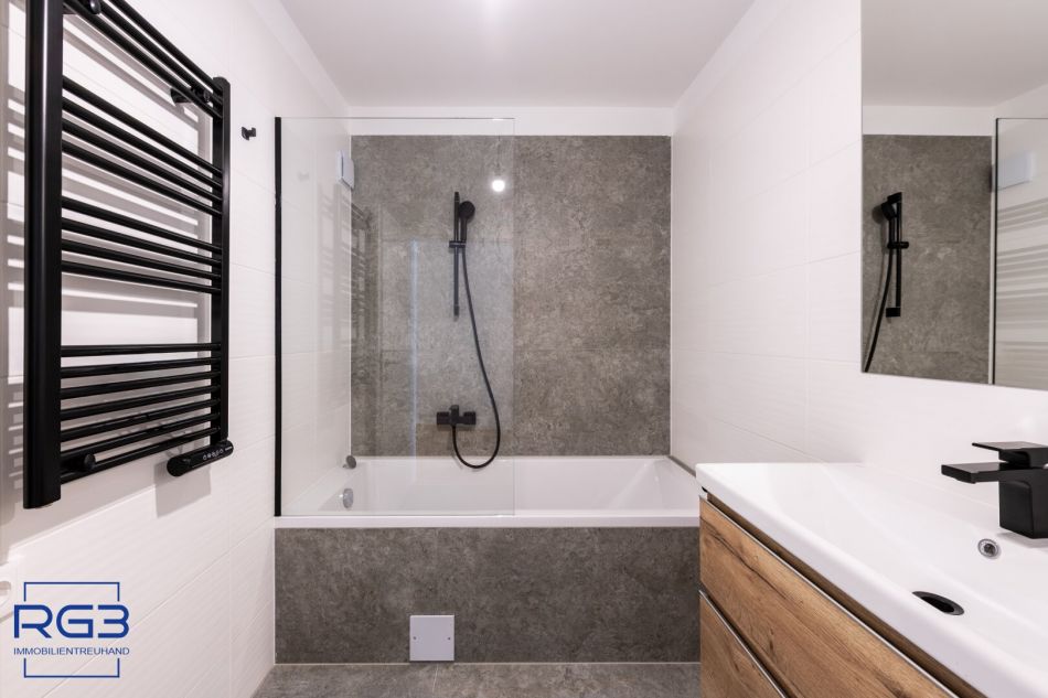 Mit dem Lift fahren Sie bequem in den ersten Stock. Sie betreten die Wohnung und spüren sofort: alles ist neu, alles ist ruhig, alles passt zusammen. Rechts befindet sich ausreichend Platz für Garderobe und Jacken. Links liegt das moderne Badezimmer mit extra Toilette, klar gestaltet, hochwertig ausgeführt.