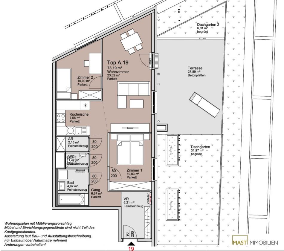 Die Wohnung befindet sich im 3. Liftstock und verfügt über 73,19 m² Wohnfläche + einen 37,28 m² großen Dachgarten + eine 27,89 m² große Terrasse.