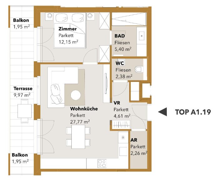 Jede Wohnung ist nicht nur mit einer Freifläche ausgestattet, sondern weißt auch hochwertige Materialien als auch Ausstattung aus: