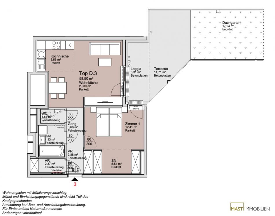 Die Wohnung befindet sich im 1. Liftstock und verfügt über 58,50 m² Wohnfläche + eine 6,31 m² große Loggia + 14,71 m² Terrasse + 17,94 m² Garten.