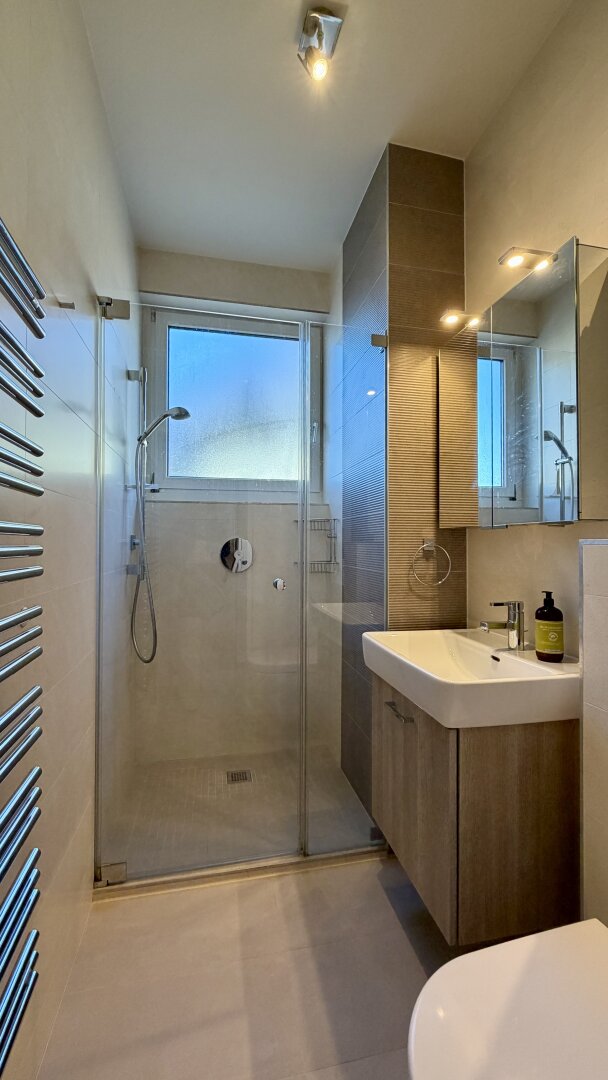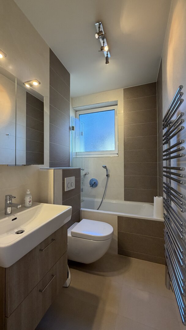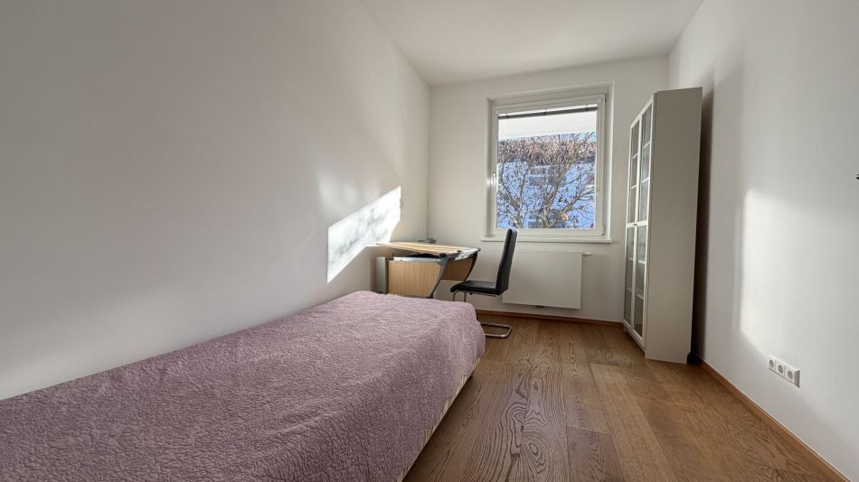 Es stehen drei Schlafzimmer mit 16 m², 12 m² und 10 m² zur Verfügung, die sich ideal für eine Familie oder für die Einrichtung eines Arbeitszimmers eignen. Zudem gibt es zwei Badezimmer – eines mit Dusche und WC sowie ein weiteres mit Badewanne und WC. Die gesamte Sanitärausstattung stammt von Villeroy & Boch und Laufen, was höchste Qualität garantiert.