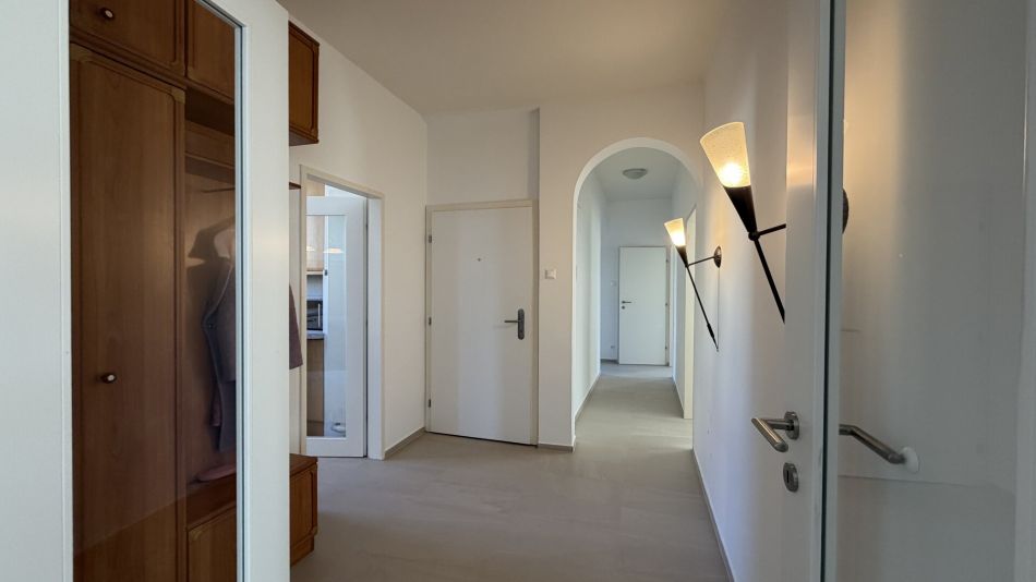 Die Wohnung verfügt über einen durchdachten und komfortablen Grundriss. Das großzügige Wohnzimmer mit einer Fläche von 35 m² bietet viel Tageslicht und eine angenehme Wohnatmosphäre. Die Küche mit Essbereich (16 m²) ist vollständig ausgestattet mit modernen Geräten von Bosch und Siemens: Herd, Kühlschrank, Geschirrspüler sowie Waschmaschine.